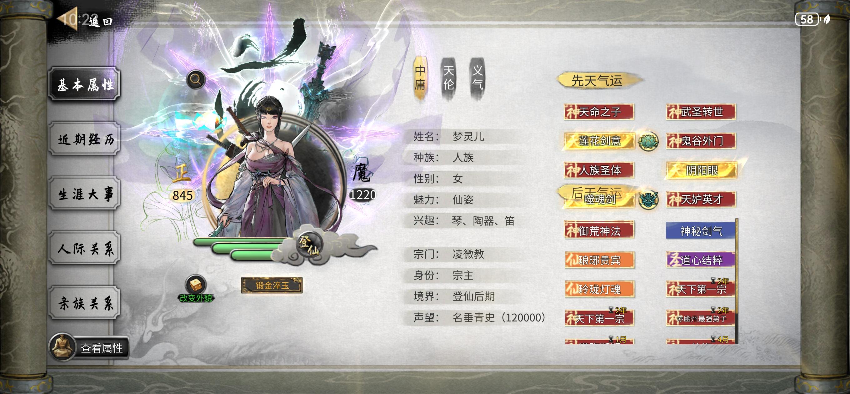 ★手游插件开满 (不开会很肝很肝)★洪荒开局(但是记得存档,死亡一次要回档,否则会被强行删档,只能重开。基本拿了噬魂剑,和天香的“帝花道君”游戏就变简单了。实在没信心可以选普通玩,其他难度不建议)★建议选最多NPC的选项 ,更多互动,也方便找Bug功法★天命气运介绍:★青莲剑仙:产生各种功能的莲子,强在资源获取,伴生技能需要配合剑系功法。主要是再也不缺复活药了,不需要为了亲友去学什么三生九