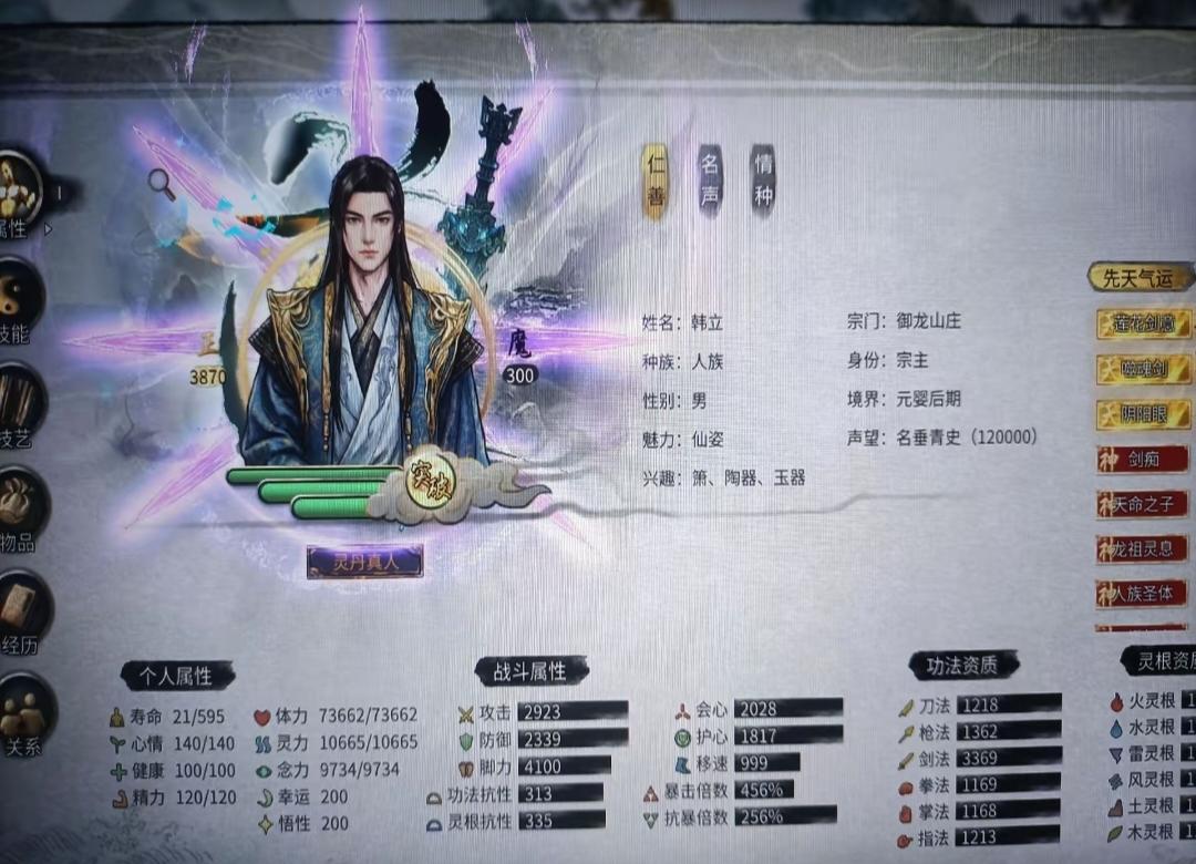 ★手游插件开满 (不开会很肝很肝)★洪荒开局(但是记得存档,死亡一次要回档,否则会被强行删档,只能重开。基本拿了噬魂剑,和天香的“帝花道君”游戏就变简单了。实在没信心可以选普通玩,其他难度不建议)★建议选最多NPC的选项 ,更多互动,也方便找Bug功法★天命气运介绍:★青莲剑仙:产生各种功能的莲子,强在资源获取,伴生技能需要配合剑系功法。主要是再也不缺复活药了,不需要为了亲友去学什么三生九