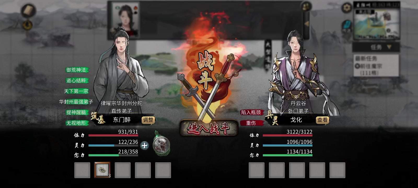 我方逆天:凝元寂灭+天地同寿+载物无疆+踏雪无痕。 满血进场,拳武技上盾,莲花剑意给闪避,环狗技能限伤。 对面:说完了吗?一招秒了。