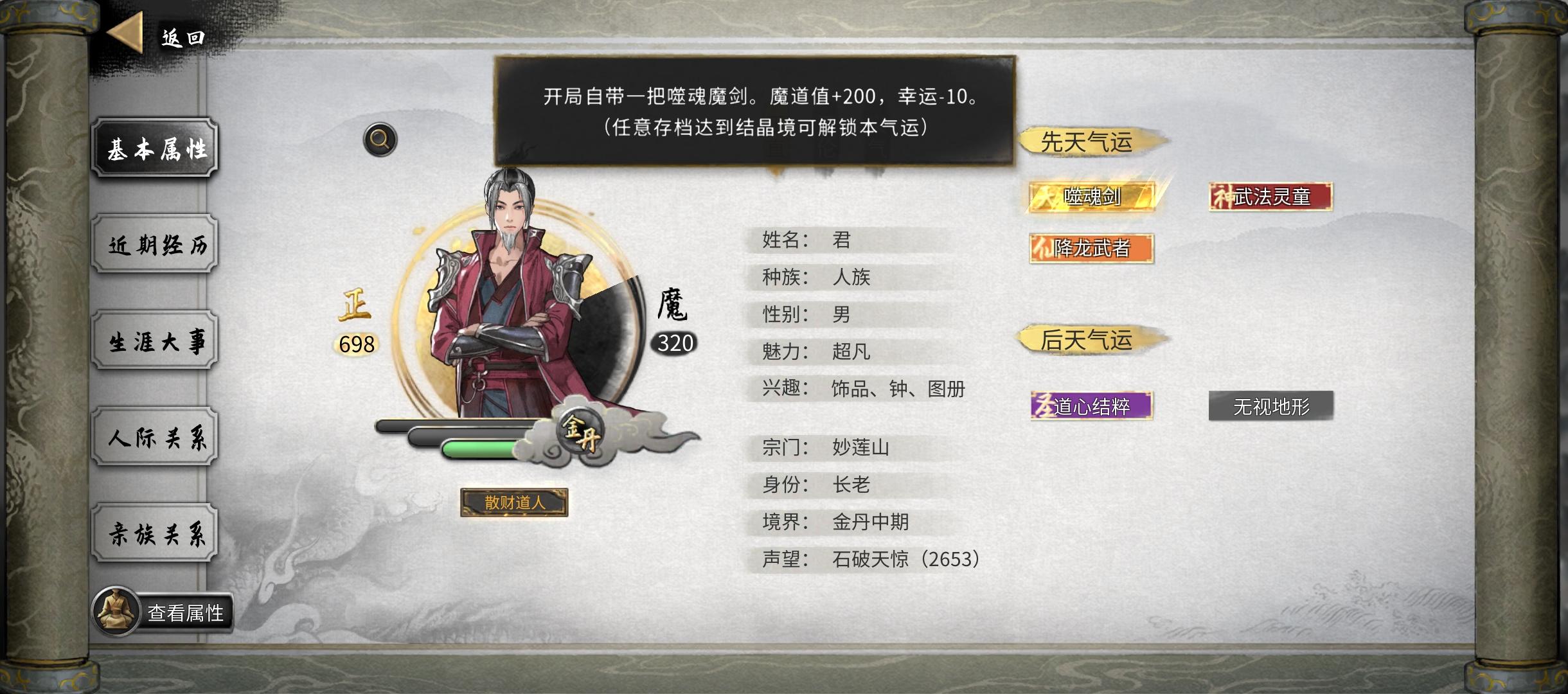 ★手游插件开满 (不开会很肝很肝)★洪荒开局(但是记得存档,死亡一次要回档,否则会被强行删档,只能重开。基本拿了噬魂剑,和天香的“帝花道君”游戏就变简单了。实在没信心可以选普通玩,其他难度不建议)★建议选最多NPC的选项 ,更多互动,也方便找Bug功法★天命气运介绍:★青莲剑仙:产生各种功能的莲子,强在资源获取,伴生技能需要配合剑系功法。主要是再也不缺复活药了,不需要为了亲友去学什么三生九