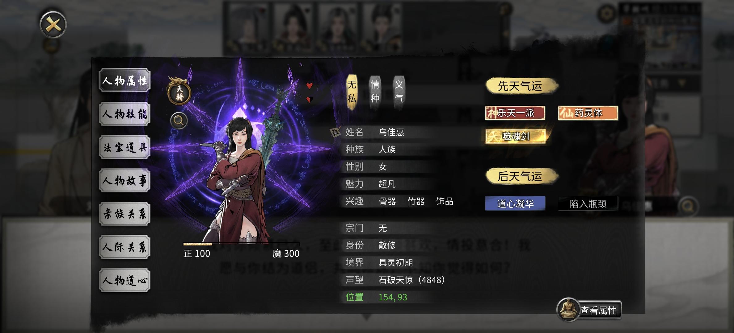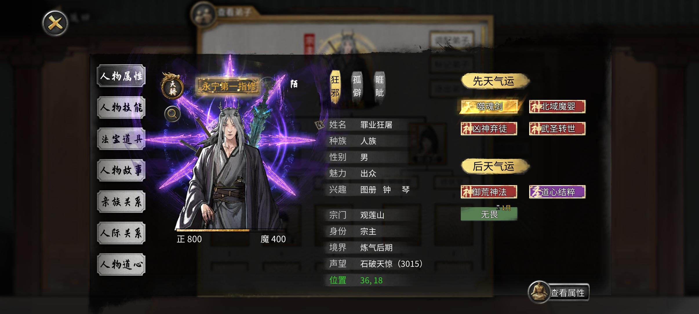 第一把玩普通模式试试水,找了不少攻略看,决定去玩火剑。拜的宗门只有剑,就只能去城市买绿色火身法。神通攻略说不重要也就没带。武学是月影碎星(绝影刷半天都是紫的,实在太坐牢了,就换了个红的碎星),逆天跟攻略说的sl刷了血灵和血魔,结果如同鸡肋根本用不上。筑基后期过月时莫名其妙被一个结晶后期的疯女人杀了,一复活就猛刷材料等结晶中期把她给杀了。结果结晶后期又莫名其妙来了个金丹后期打我,还把我功法抢了。过