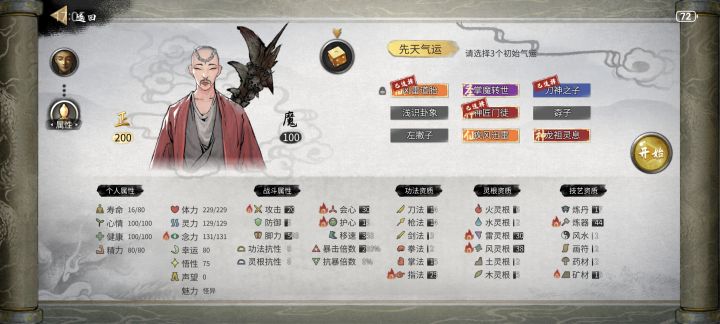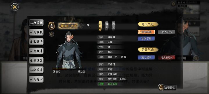 开始前准备,插件全开,选择洪荒模式,NPC数量较多(更好的刷到厉害的NPC) 先天气运必备:阴阳眼、大能转世 性格推荐:忠贞(好结道侣),传承(好拜师),中庸(对所有人都一样) 剑,风灵根资质尽量高(节省SL灵果时间) 神器选择:双鱼佩 1.进游戏先确认阴阳眼是否能正常触发(保证后续镇妖魂能正常触发,触发了其他的魂要回档,确保镇妖魂能稳定触发两次) 2.零步大法(走完零天的步数后保存,