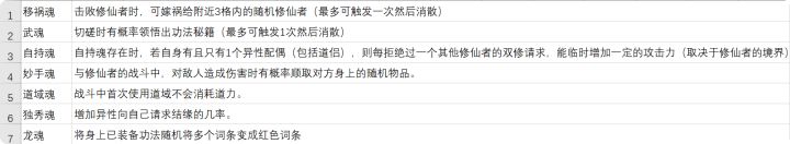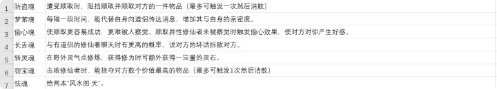 防盗魂:防止物品被盗。移祸魂:杀人后嫁祸给他人。雾水珠:提高魅力和增加双修概率。解意魂:自动调解伴侣关系。梦絮魂:增加伴侣亲密度。武魂:在切磋后定制功法。酒魂:增加喝酒的buff时长。偷心魂:偷取异性物品没发现增加好感。自持魂:作为唯一配偶时,拒绝他人双修,增加临时攻击力。月老魂:与人交谈时,容易介绍自己单身亲友。长舌魂:劝人离婚。妙手魂:战斗中几率偷取物品。论道魂:论道时