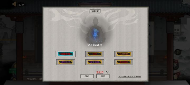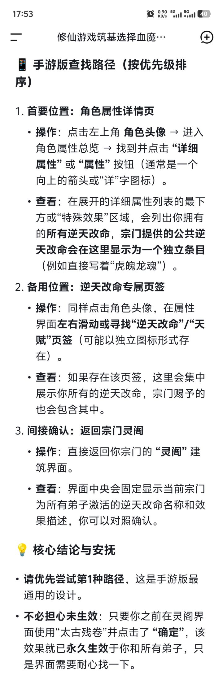 鬼谷八荒才玩了没几天,我一直有个疑问?宗门的逆天改命是不是只有在境界提升后,在宗门突破那个里面选了才生效,我问了deepseek。它说只要在宗门我用了太古残卷之后直接就生效了(我是用太古残卷改了宗门的逆天改命)但是我实际体验下来又没有那个虎魄龙魂的逆天改命所以很疑惑?还有就是我玩的火剑流,逆天改命推荐什么最好啊(手游版)现在是元婴境前面逆天改命选的是血灵入门到精通(金丹境)具灵选的的水力四射,