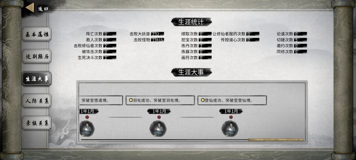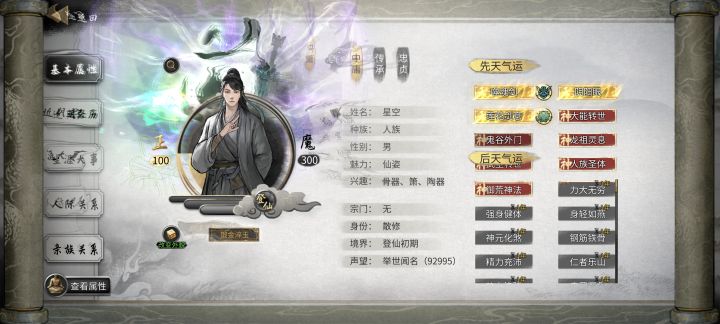 开始前准备,插件全开,选择洪荒模式,NPC数量较多(更好的刷到厉害的NPC) 先天气运必备:阴阳眼、大能转世 性格推荐:忠贞(好结道侣),传承(好拜师),中庸(不会被相反性格的敌视) 剑,风灵根资质尽量高(节省SL灵果时间) 神器选择:双鱼佩 1.进游戏先确认阴阳眼是否能正常触发(保证后续镇妖魂能正常触发,触发了其他的魂要回档,确保镇妖魂能稳定触发两次) 2.零步大法(步数走完后保存,
