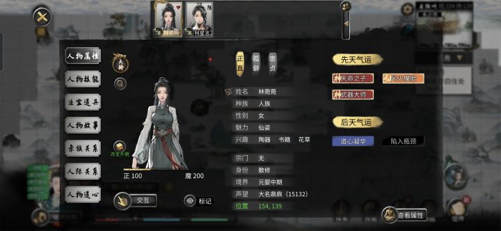 开始前准备,插件全开,选择洪荒模式,NPC数量较多(更好的刷到厉害的NPC) 先天气运必备:阴阳眼、大能转世 性格推荐:忠贞(好结道侣),传承(好拜师),中庸(不会被相反性格的敌视) 剑,风灵根资质尽量高(节省SL灵果时间) 神器选择:双鱼佩 1.进游戏先确认阴阳眼是否能正常触发(保证后续镇妖魂能正常触发,触发了其他的魂要回档,确保镇妖魂能稳定触发两次) 2.零步大法(步数走完后保存,