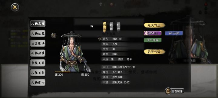 开始前准备,插件全开,选择洪荒模式,NPC数量较多(更好的刷到厉害的NPC) 先天气运必备:阴阳眼、大能转世 性格推荐:忠贞(好结道侣),传承(好拜师),中庸(对所有人都一样) 剑,风灵根资质尽量高(节省SL灵果时间) 神器选择:双鱼佩 1.进游戏先确认阴阳眼是否能正常触发(保证后续镇妖魂能正常触发,触发了其他的魂要回档,确保镇妖魂能稳定触发两次) 2.零步大法(走完零天的步数后保存,