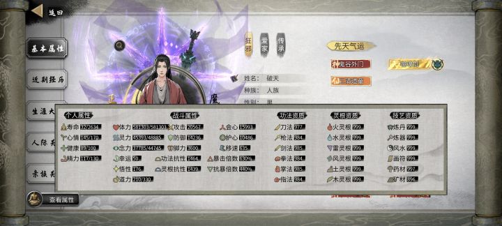 打开游戏第一步,点击主页左下角,把插件全部开启,开启爽玩模式。性格:开局性格选择仁善/中庸,➕忠贞传承。好人性格,方便结交好友,结缔亲族关系,还不至于无私那种烂好人,过月麻烦多。先天气运选择:莲花剑意和阴阳眼这两个金色的先天气运不论功能性还是面板强度都是顶中之顶,必拿,噬魂剑可以后天获得,不选。鬼谷外门,武圣转世,人族圣体为性价比三件套,攻击悟性都有,属性管饱。武法灵童和六根不净加12种流派