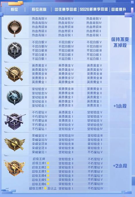 和平精英是很多喜欢吃鸡玩家常驻喜欢体验的指尖战场竞技游戏,提供了好玩优秀生存枪战的特色娱乐玩法,生存夺金的特色娱乐都能轻松配置,有着好玩优秀战术竞技的特色,里面也是有着段位机制的,每个赛季都能带来继承向的操作,本期为大家分享和平精英段位继承图表2024版的内容! 和平精英段位继承图表2024版分享 超级王牌6星以上——铂金1 皇冠1到超级王牌5星——铂金2 皇冠2和皇冠3——铂金3 皇冠4