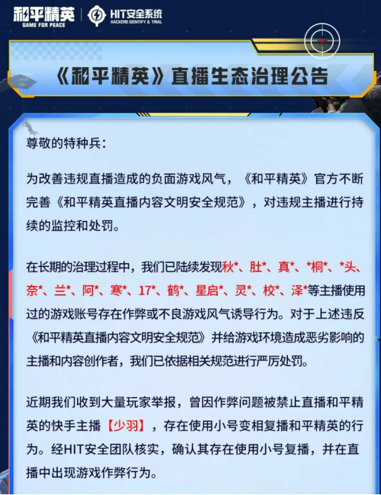 最近,《和平精英》官方发布直播生态治理公告,对曾因开挂被封号禁播的千万粉丝主播“少羽”施以重拳:其使用的8个游戏账号因作弊被处以封禁3650天(十年)的顶格处罚,并联动直播平台全面封禁其所有直播小号。少羽早年以《和平精英》技术教学视频积累粉丝,2021年1月,他因使用定制外挂首次被官方封号,并被快手平台禁播。然而,他并未收敛,反而通过小号复播,并公开辩解“未在直播中开挂就不算违规”,甚至宣称遭