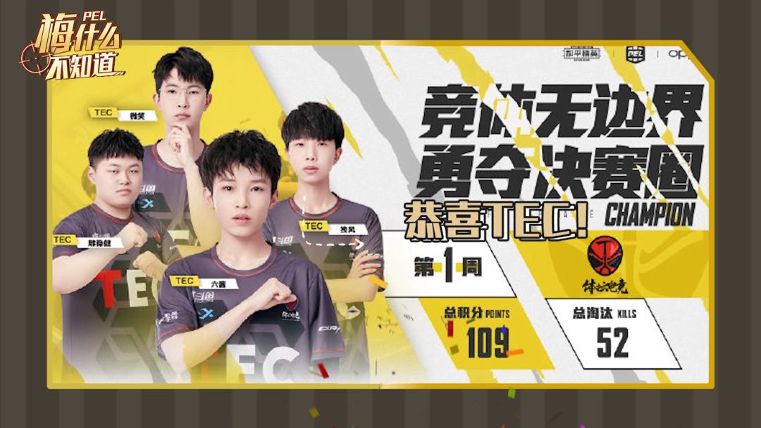 3月14日,全面升级的PEL和平精英职业联赛2021年S1赛季常规赛首周比赛圆满结束。15支战队经过2日周决赛10场的鏖战,最终TEC战队技高一筹,以总积分109的成绩成为本赛季最先摘下周冠军桂冠的队伍,将首枚周冠军戒指和首份百万奖金一并收入囊中。传统体育媒体强势入局 TEC战队收获首周百万奖金 TEC战队在首周次日淘汰赛以排名第7成绩拿到周决赛门票。回顾周决赛两日比赛,周决赛首日TEC战队状