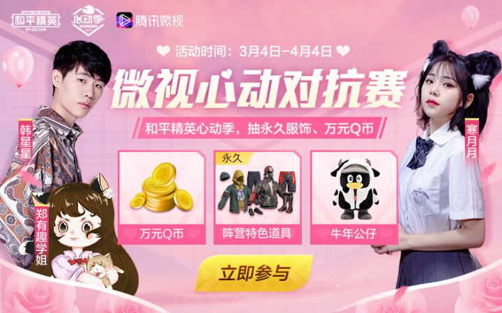 把握心动,甜蜜暴击!3月4日到4月4日,和平精英携手腾讯微视联合推出和平心动对抗赛开启啦!各位特种兵准备好为自己喜欢的阵营助阵了吗?活动期间加入喜欢的阵营,带指定话题发布内容,有机会赢取海量奖金,快来腾讯微视APP发布视频,参与活动吧~助阵情侣/单身阵营赢好礼本次活动特别邀请了韩星星和郑有趣学姐担任情侣阵营发起人,同时也邀请了寒月月担任单身阵营发起人,特种兵可选择自己想要加入的阵营加入。Ø