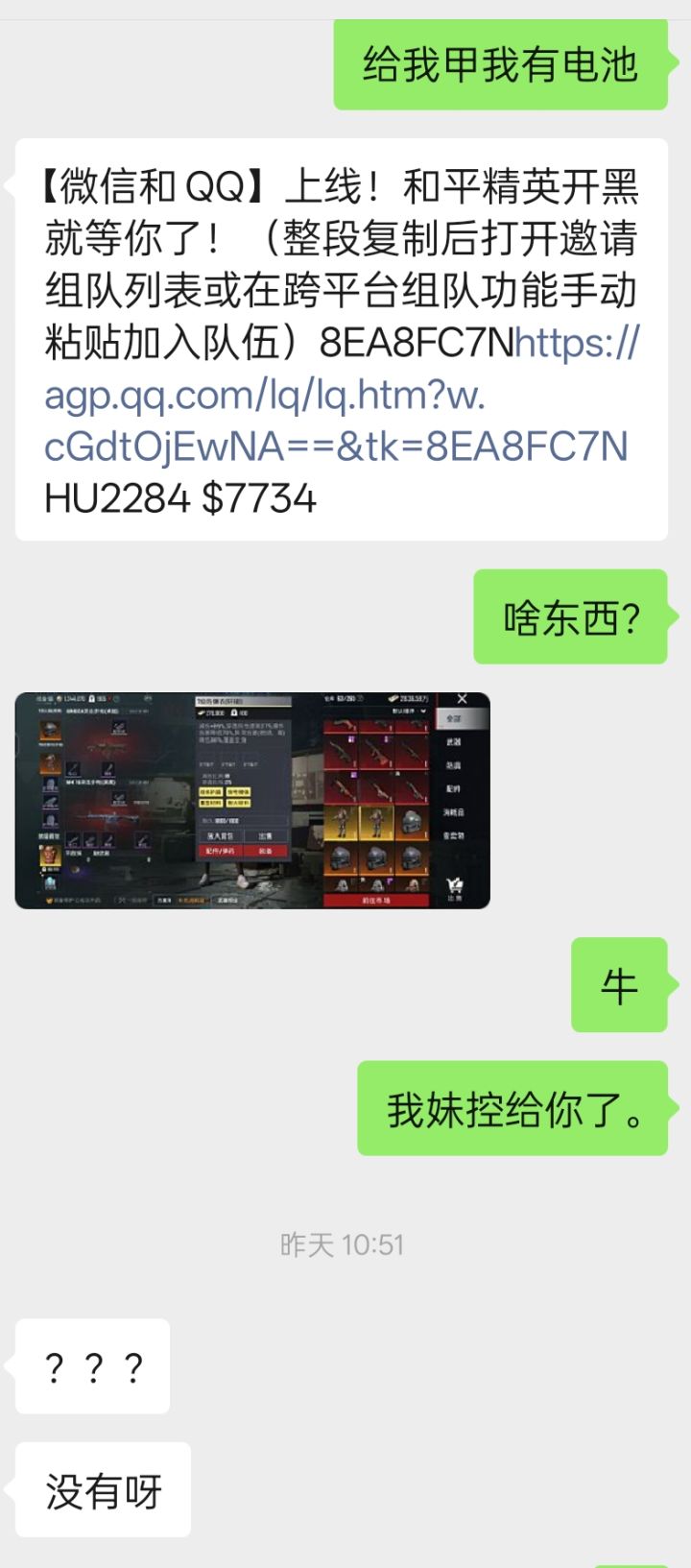 至于为什么我不合?刚弄出来的时候我拉了他两次,我字都没打完他直接退了,然后又去打了10分钟的绿洲他出来的时候,当时我也有电池我说我合吧,当时他说他合因为当时他迟迟不给我,我就给他了
