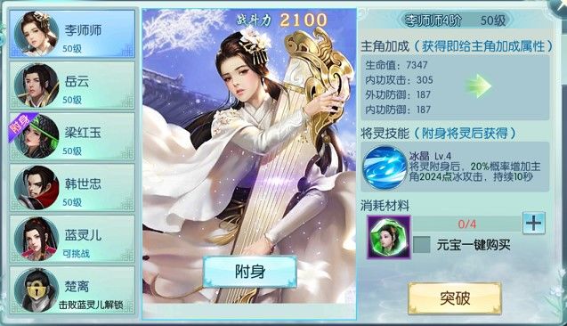 《一剑问情》中总会遇到自己一个人打不过去的关卡,这时将灵系统就派上用场了,根据自身属性以及关卡boss属性或者对手属性选择对应将灵附身,打出成吨输出,更能看到熟悉的人物与自己并肩作战!将灵系统在人物到达33级开启,分为六大将灵:李师师(冰),岳云(雷),梁红玉(毒),韩世忠(火),蓝灵儿(暗),楚离(光)。玩家通过将灵挑战的方式来获得将灵。每个将灵都有对应元素的一个将灵技能,玩家选择附身后,就