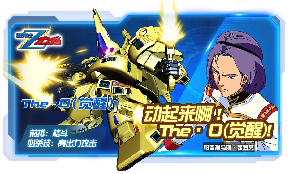 The・O(觉醒)是西罗克在朱庇特李斯号上制造的第四台MS,是作为西罗克的专用机而被开发的,“The·O”有代表“神的意志”的寓意。作为五月第二台新机体,它有什么特别之处呢?让我们来看一下它的阵容搭配! 先划下技能重点 必杀技:高出力攻击(130级效果) 对敌方全体造成27300点额外伤害,使目标不安3秒,我方出战5台多模式机体,多模式机体身上护盾消失时,对敌方全体有50%的概率造成2秒瘫痪,冷却