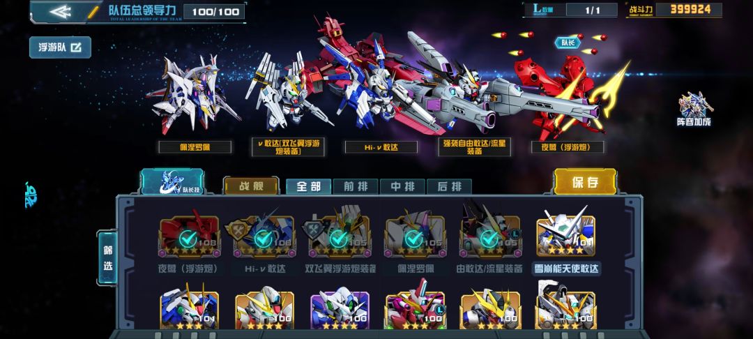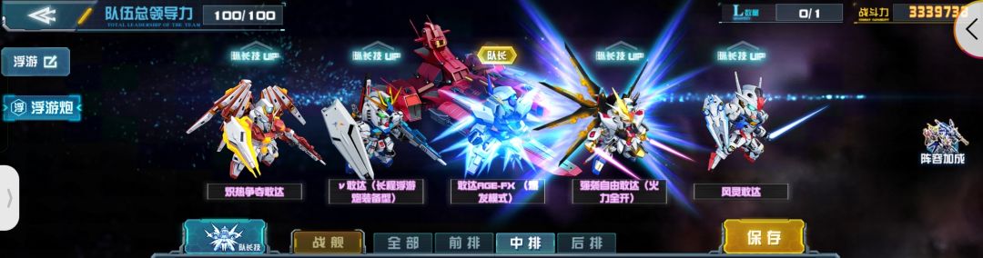经过数个版本的提升与新机体的加入,浮游队也慢慢提升着自己的实力与地位。那我们一起来看下浮游队的发展史吧。 早期 浮游炮队卡碧尼(觉醒),Ξ敢达,ν敢达(双飞翼浮游炮装备),Hi-ν敢达,敢达AGE-FX 队长技:Ξ敢达 战舰:阿伽玛 点评这是初期的浮游炮队伍阵容,没有大型机,也没有浮游炮阵容专属战舰。 20年9-10月 统御式浮游炮队 卡碧尼(觉醒),Ξ敢达,ν敢达(双飞翼浮游炮装备),统御式,敢