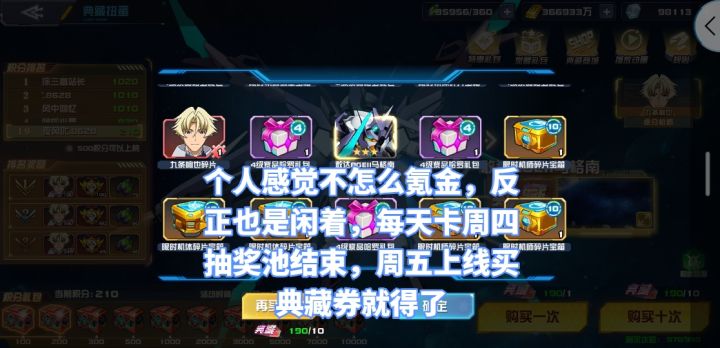 2022/03/07,神敢达/明镜止水大加强,出现了三典藏无敌队,零氪微氪建议先观望,各种玩法中很难有好的体验。因为联合作战的原因,不加微信很难加入厉害的公会,如果能无视pvp玩法,安心单机的话还是可以玩的----------------------------这个游戏新号开局给的东西很多,前期的进度影响也很大,所以一般不存在钻石号初始号。建号一定要选择开服第一天,有个14天的活动送80个7