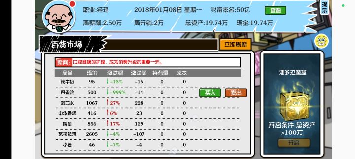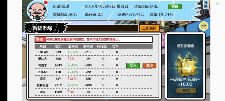 5.随着时间提高工资和消耗不合理,建议改成花钱买股份得分红,主角每个星期的消耗破产太让人烦,次次都要预留点钱,建议取消,或者加入银行,存钱在银行自动扣。