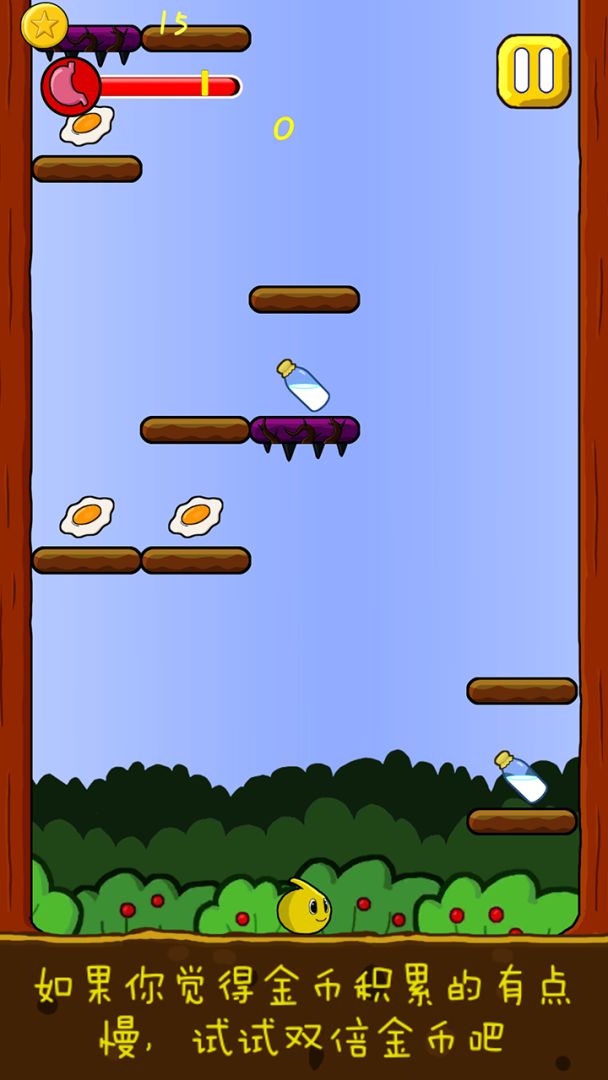 一只可爱的小不点,想要吃到美味的食物,帮助它越过重重障碍向上跳跃吧,这样它就可以吃饱饱咯。