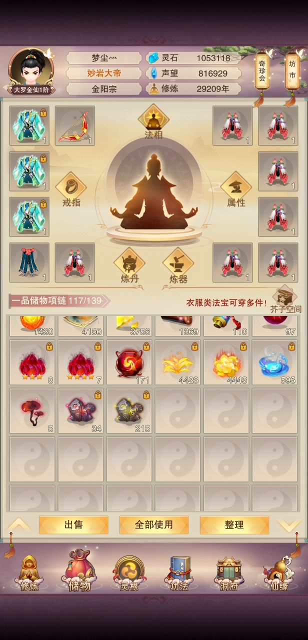 修真1280年,上天啦。分神8阶上的天,发现除了捡捡前辈空下的星君,等刷悟道茶,本身属性过不了天一、接引使等等。等聚灵阵139了,属性应该够刷天一了。继续回头刷图七、图五、吃满丹、学满秘籍,这时还没洞虚,就去上清悟炼丹。 修真1322年,静思天地真义,追求永恒大道,有所感悟,境界提升到:合体1阶。这个阶段就开了一个大能遗府,没有新门派。未来几千年,有时间做上面说的内容了。 修真1870年,聚
