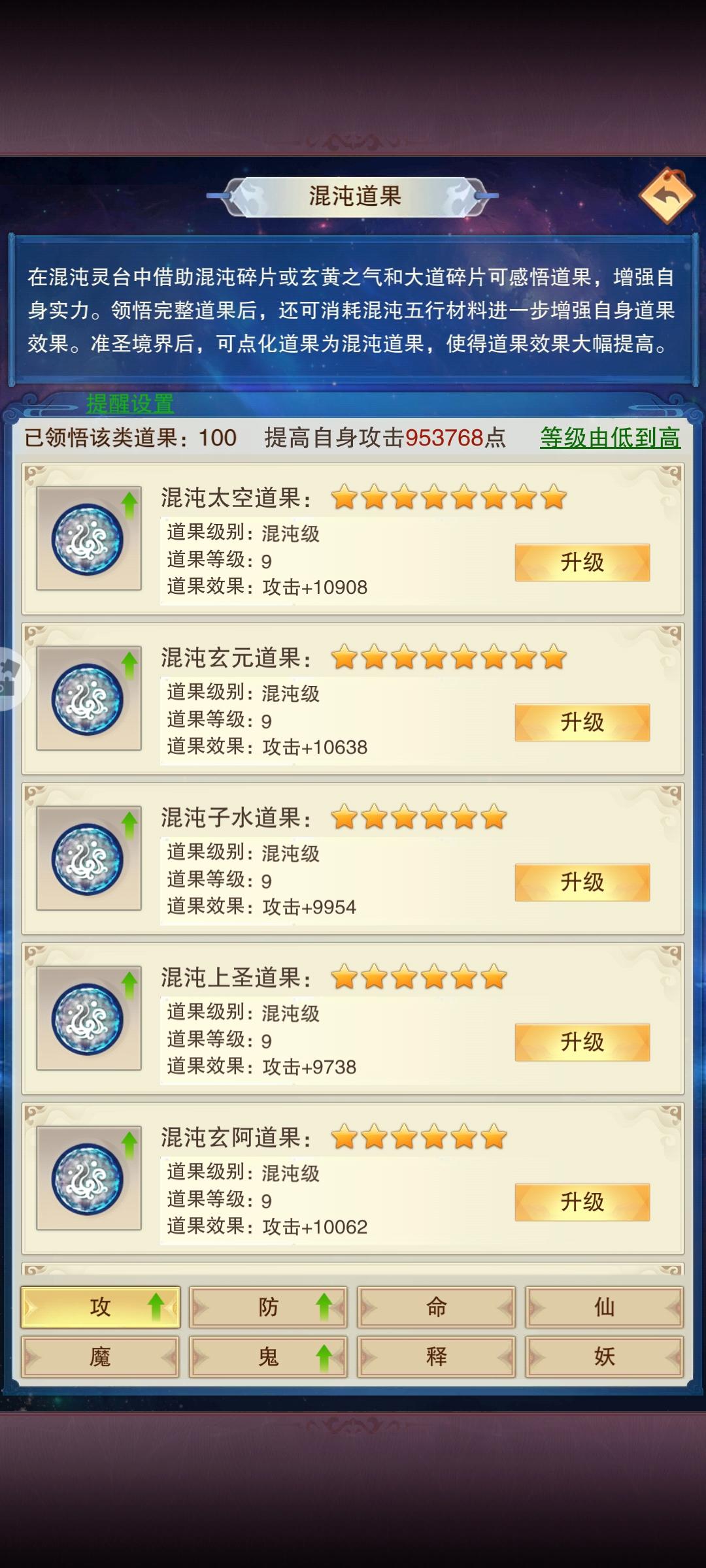 道果 在混沌灵台集齐一定数量道果碎片后,即可领悟此道果。 天尽崖~弥天域:集齐10个碎片 雨霖域~天隐域:12个 青洪域~玄阳域:14个 青曜域~渡业谷:16个 在玄都混元证道的混沌道果处/混沌灵台可以升级道果,道果每升级1级,增加1倍基础属性。升级耗费玄黄之气和五行材料。 道果满级初始为10级(推荐升到8级),境界圣人后可继续提升品级。 境界准圣后消耗1000玄黄之气和2滴鸿蒙原液可以将道果点化