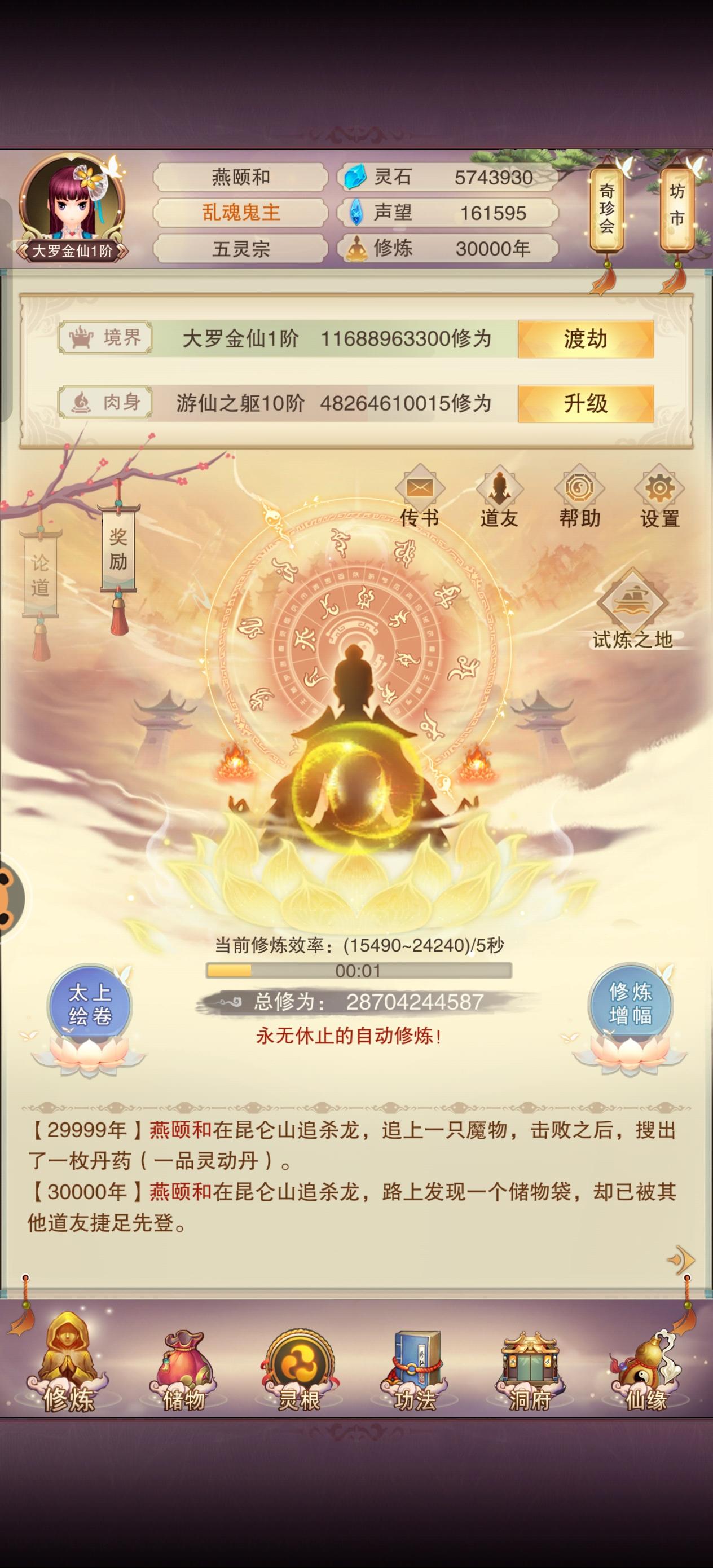《想不想修真》基础功能介绍 最主要的3个点:灵石,声望,修为;灵石和声望可以再仙缘中打怪物获取,修为是按照时间提供,修为高,灵根高拜入的门派才会高。 1.界面分为修炼,灵根,功法,洞府,仙缘,鬼市等5个界面 修炼界面: 境界是人物的等级,会影响人物拜的门派等级和修炼增长速度,建议优先升级,练气期需每3分钟修炼一次,到筑基期后会自动修炼(下线也会修炼)一年365天.24小时无间断。 肉体会加人物的防