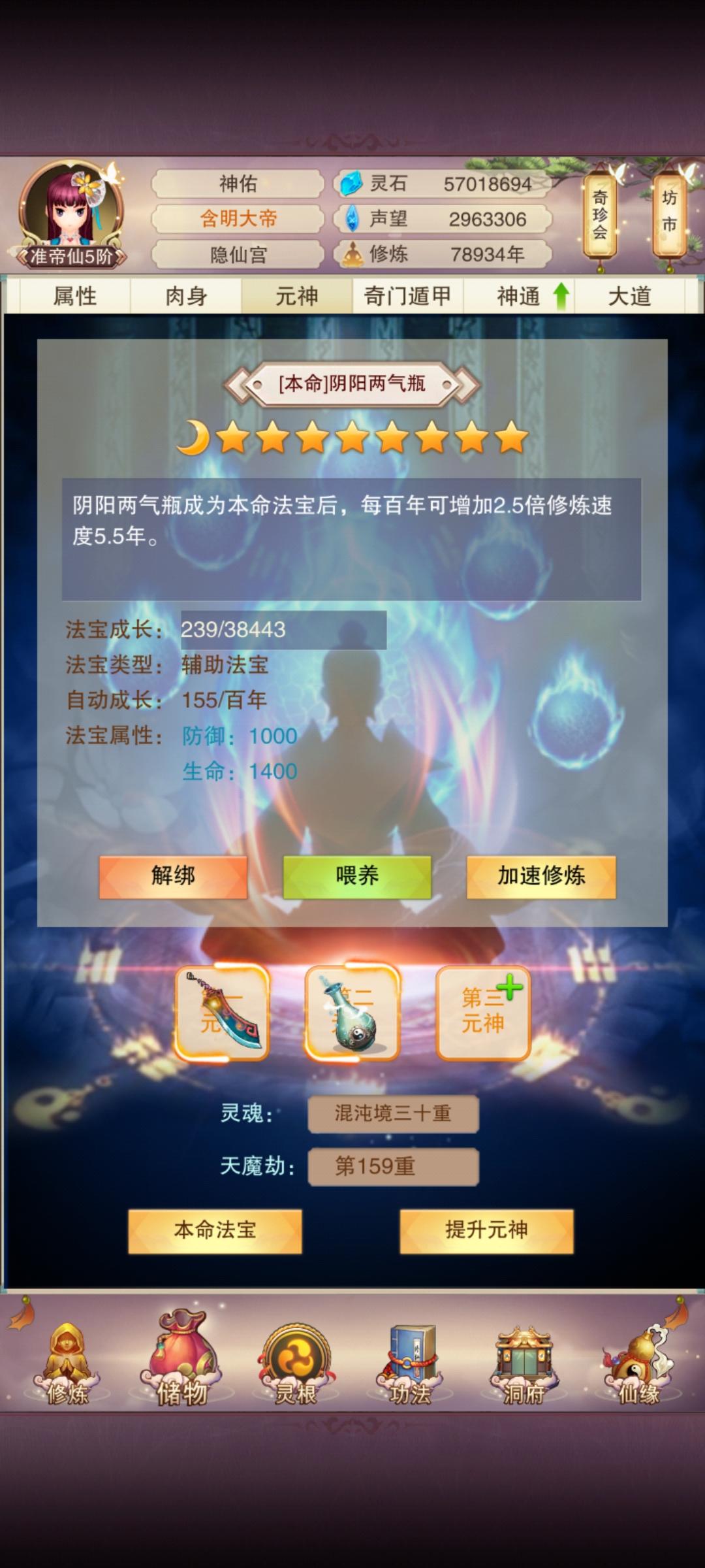 先上图 一、混沌长河 找到苍空岛——进入苍空岛秘境→找到混沌长河→渡河、碰到怪打架→得到圣人印记 圣人印记感悟加属性 二、洞府大阵 1、封印大阵: 原来的那些阵法,去掉了,说跟没说一样。 2、洞府大阵: 到仙界前九个天功德司、神界赤霄天九个愿力祠、玄黄祠二楼买阵图→上阵道童→探索天地玄门遗址获得压阵法器→上阵法器→启动阵法消耗灵气加属性、用阵法熟练度提高阵法等级 总结:聚灵的书性价比变高了,不管是