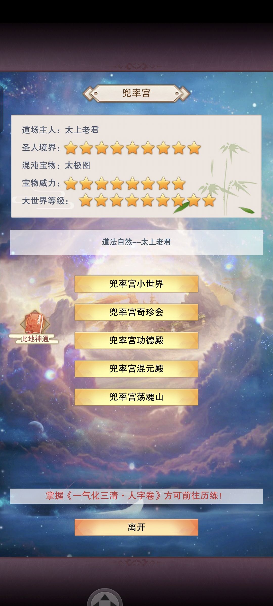 等605个神识点开完,神界神通也基本毕业了, 就该着手准备重刷三界炼仙丹了 【功德购买型】: 【天外天仙丹无法炼制】18个天外天,一组丹6万功德,攻防共须要216万功德。可获得36万攻和36万防。 当前功德固定收入:(1678) 界主900+17功德408+功德果235+进度135; 功德固定支出:(1050) 12杯茶800(茶树4杯)+三兽岛100+地府100+三秘境50; 剩余628功德每天