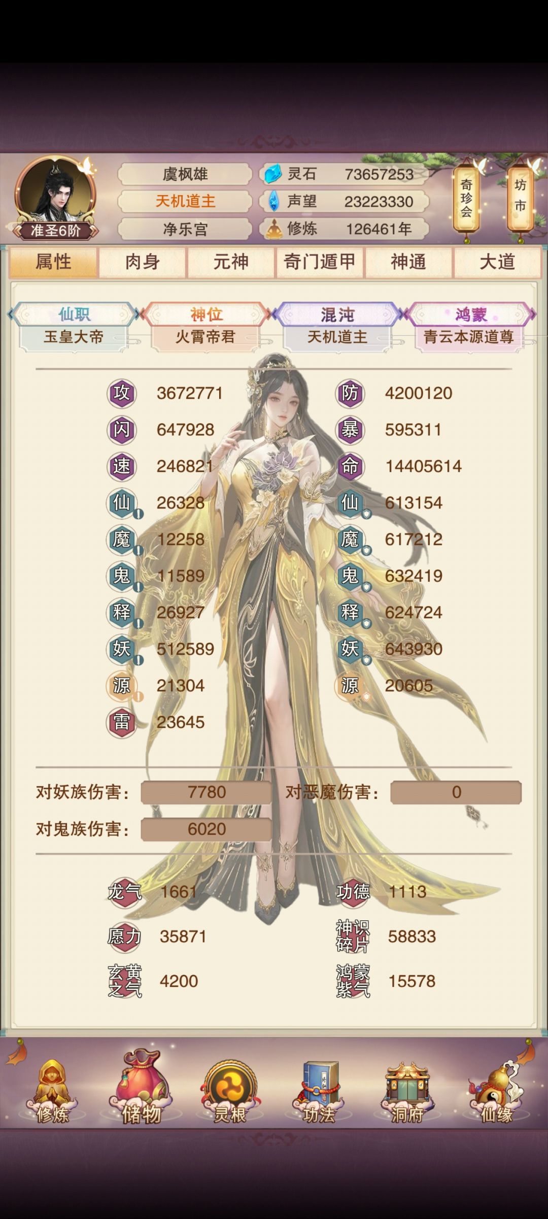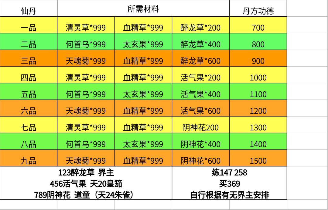 等605个神识点开完,神界神通也基本毕业了, 就该着手准备重刷三界炼仙丹了 【功德购买型】: 【天外天仙丹无法炼制】18个天外天,一组丹6万功德,攻防共须要216万功德。可获得36万攻和36万防。 当前功德固定收入:(1678) 界主900+17功德408+功德果235+进度135; 功德固定支出:(1050) 12杯茶800(茶树4杯)+三兽岛100+地府100+三秘境50; 剩余628功德每天