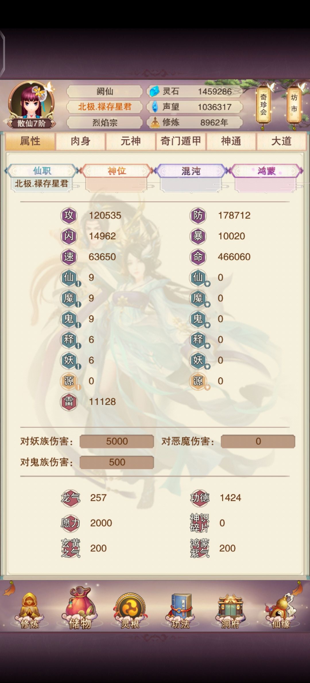 技能点70,属性如下 已过功德12,学了神兽攻,没学神兽防,开天11缺攻,目前已开3天,目前打元帅暴击39%+就不会翻车。2k功德进的神兽,天仙前不再刷门派,7星差灵虚,8星差青云和宵水,9星差玄武。8进玄天,4进五灵,还是没刷到神兽,不浪费声望了,攒着升技能点和预备刷鬼王,天仙先刷到青云就青云挂6阵了,鬼王随缘,可能仙君/仙尊愿力买信物补。 功德2025,背包5个红莲,功德树目前8树,还没买人字
