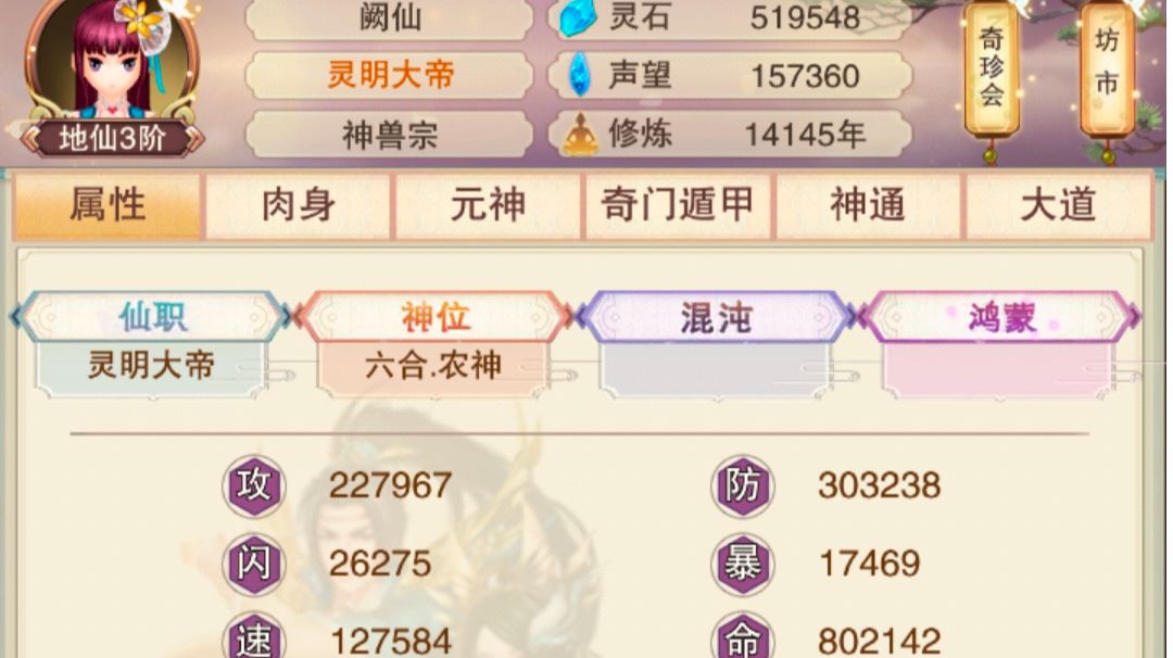 属性和技能点如图所示 1.27+聚灵228,目前肉身万象9+38e,均跳大概15.7,预计1.55天仙吧,区环境好些(不堵车)的青云+氪600/900天秘+欧点儿,速度可超我。 分神没氪3天掌门,氪150绝秘,合体补氪150*4+120=720绝秘,因为堵车第一本3k天秘耽误了2周多。目前刷门派还差7星1个,8星2个:青云和宵水,9星2个:神兽和玄武,如果欧/正常些的话,现在已刷到神兽(和青云),