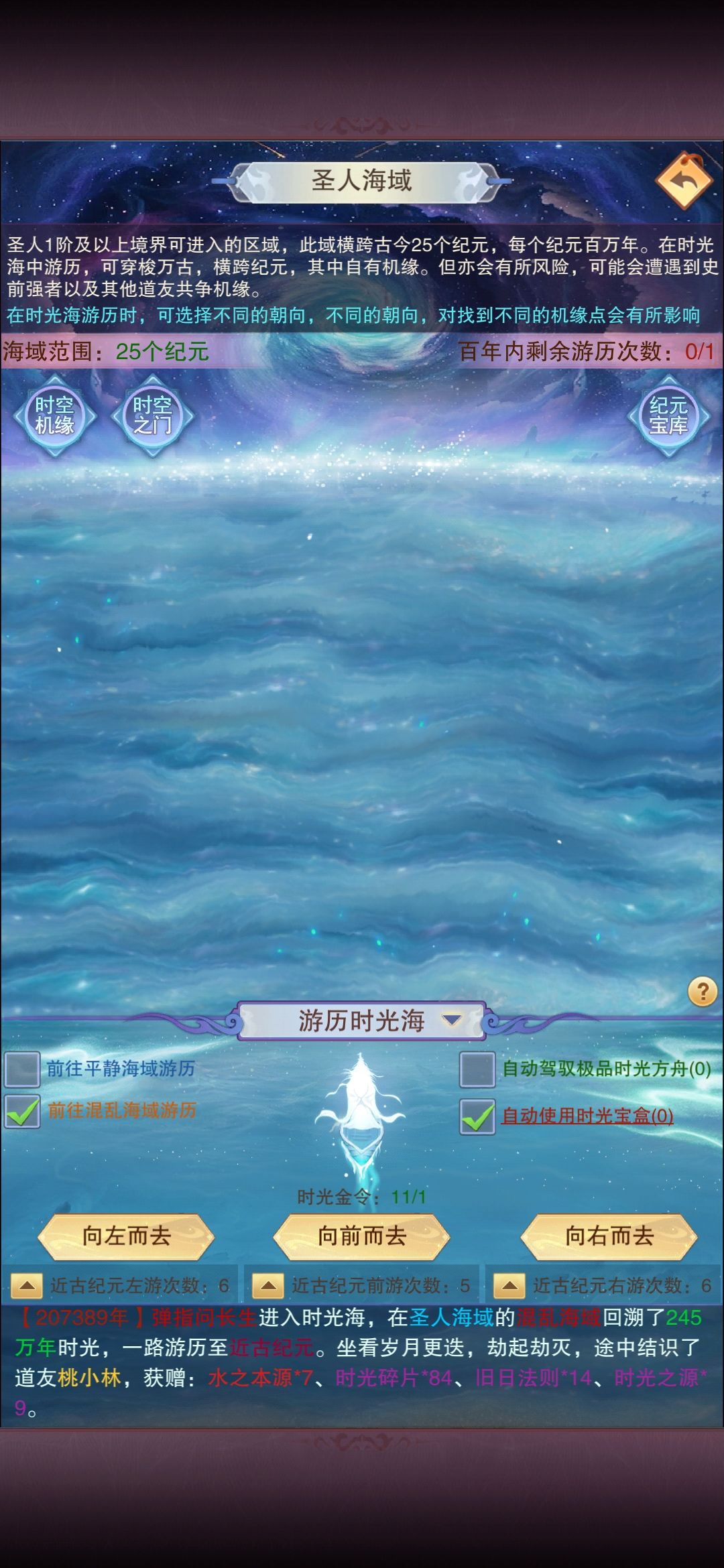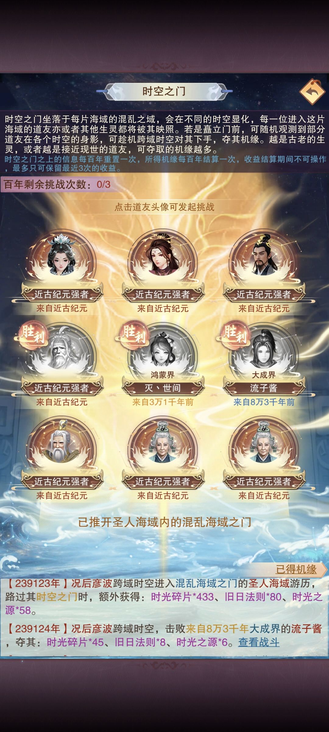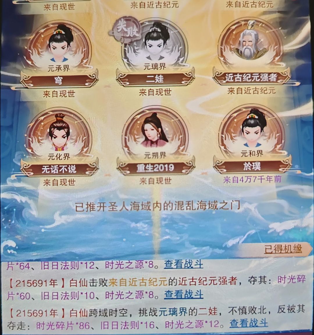 概念翻译 纪元->大地图(他化自在秘术十卷,所以猜测大地图有十个) 道友->玩家 史前纪元的强者->npc 一方寰宇->同一渠道不同服务器 时光海游历 每天100紫气游历 打npc,赢了才能拿奖励,输了无 打玩家,赢了100%奖励,输了50% (14)应该指的在更高的地图探索,可以同步低级地图的进度。(大概率就是每个地图有自己的奖励,如果在高级地图探索,可以同步领取低级地图的奖励,而不需要再次探索