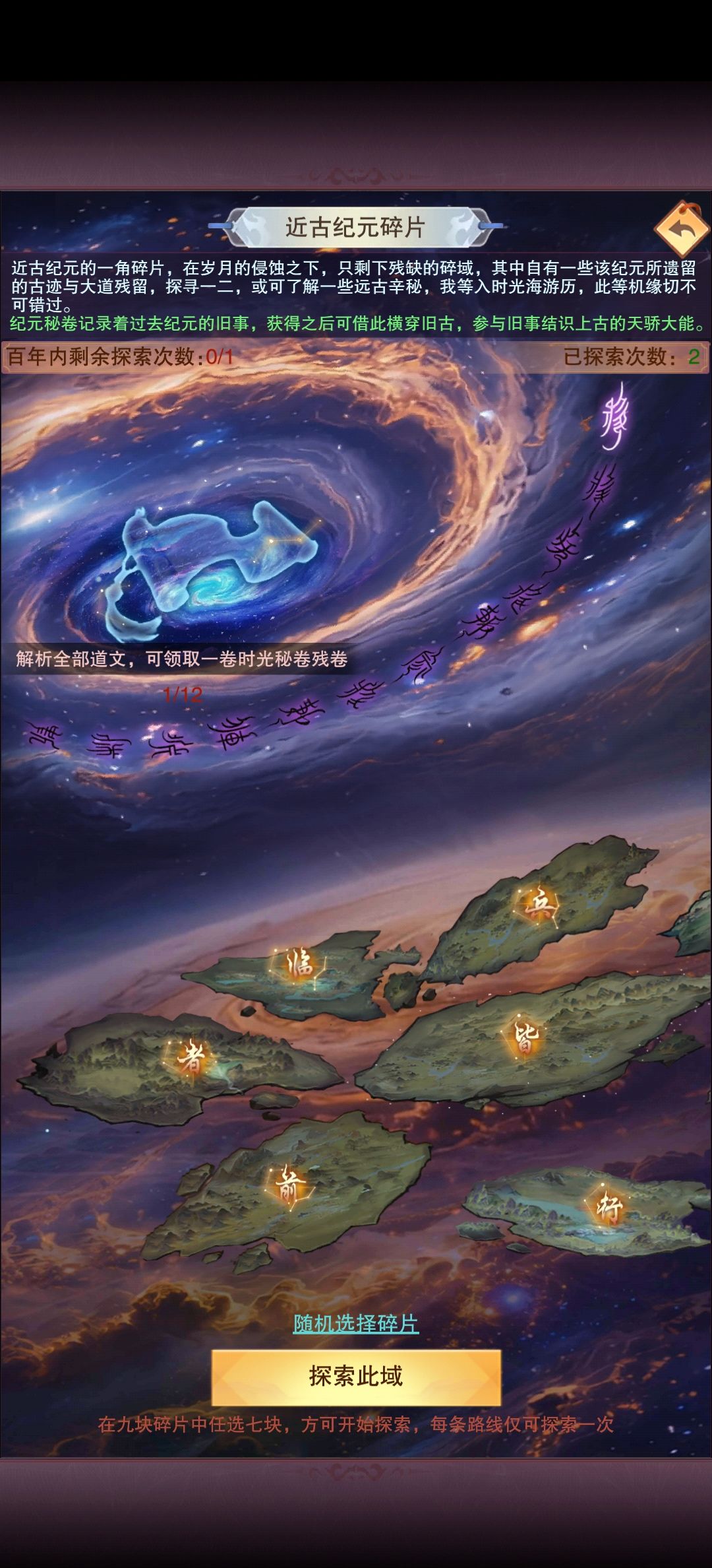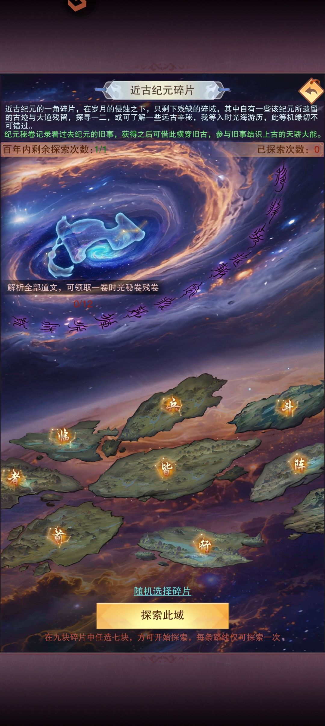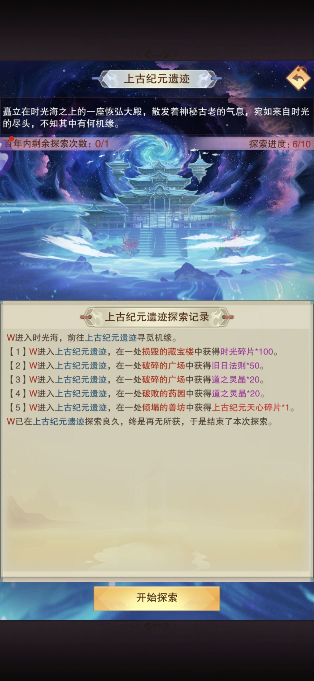 概念翻译 纪元->大地图(他化自在秘术十卷,所以猜测大地图有十个) 道友->玩家 史前纪元的强者->npc 一方寰宇->同一渠道不同服务器 时光海游历 每天100紫气游历 打npc,赢了才能拿奖励,输了无 打玩家,赢了100%奖励,输了50% (14)应该指的在更高的地图探索,可以同步低级地图的进度。(大概率就是每个地图有自己的奖励,如果在高级地图探索,可以同步领取低级地图的奖励,而不需要再次探索