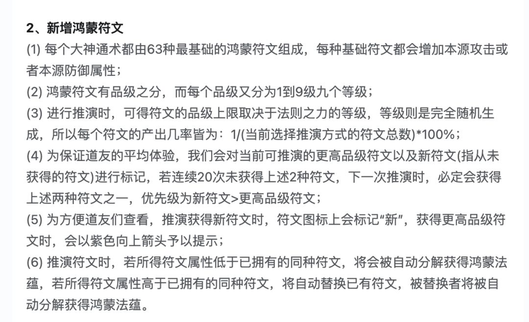 最近刚开衍道场,于是纠结大神通相关的法则之力是否该升级。梳理之后,顺带记录以及分享给有需要的道友。 图片是更新内容,从这个内容可以得出 1、只能推演有激活的法则之力(假设只激活了时空法则之力,即便选择的是推演全部,也只会推演时空符文) 2、符文有等级(品级),等级是随机的,上限取决于法则之力的等级 3、由于有保底机制的存在。连续20次没有获得更高级的符文且没有获得新符文,则触发保底。下一次推演,必