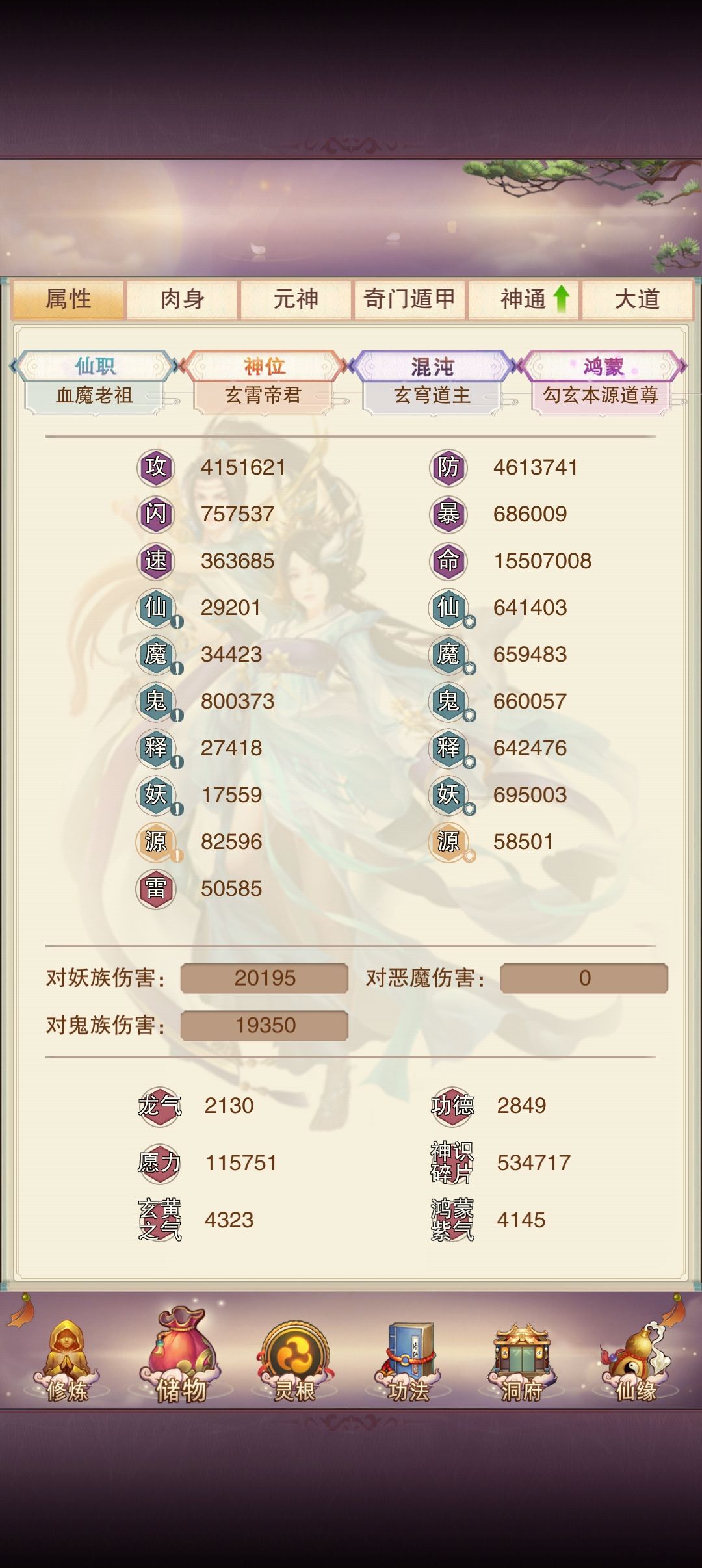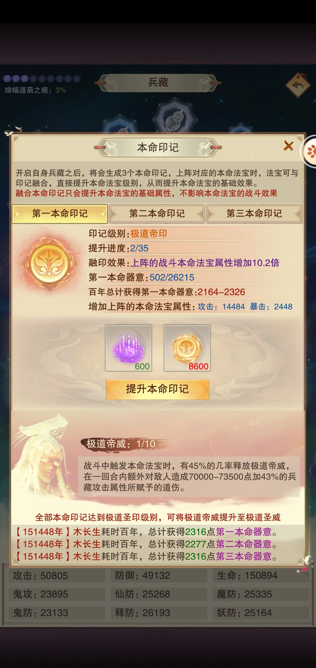 极道帝威需要投入大额功德、愿力、玄黄、紫气,仅紫气就需要投入45000。触发概率极低的同时伤害极低,堪称混沌法宝青春mini版。按概率换算,相当于面板增加4500攻击