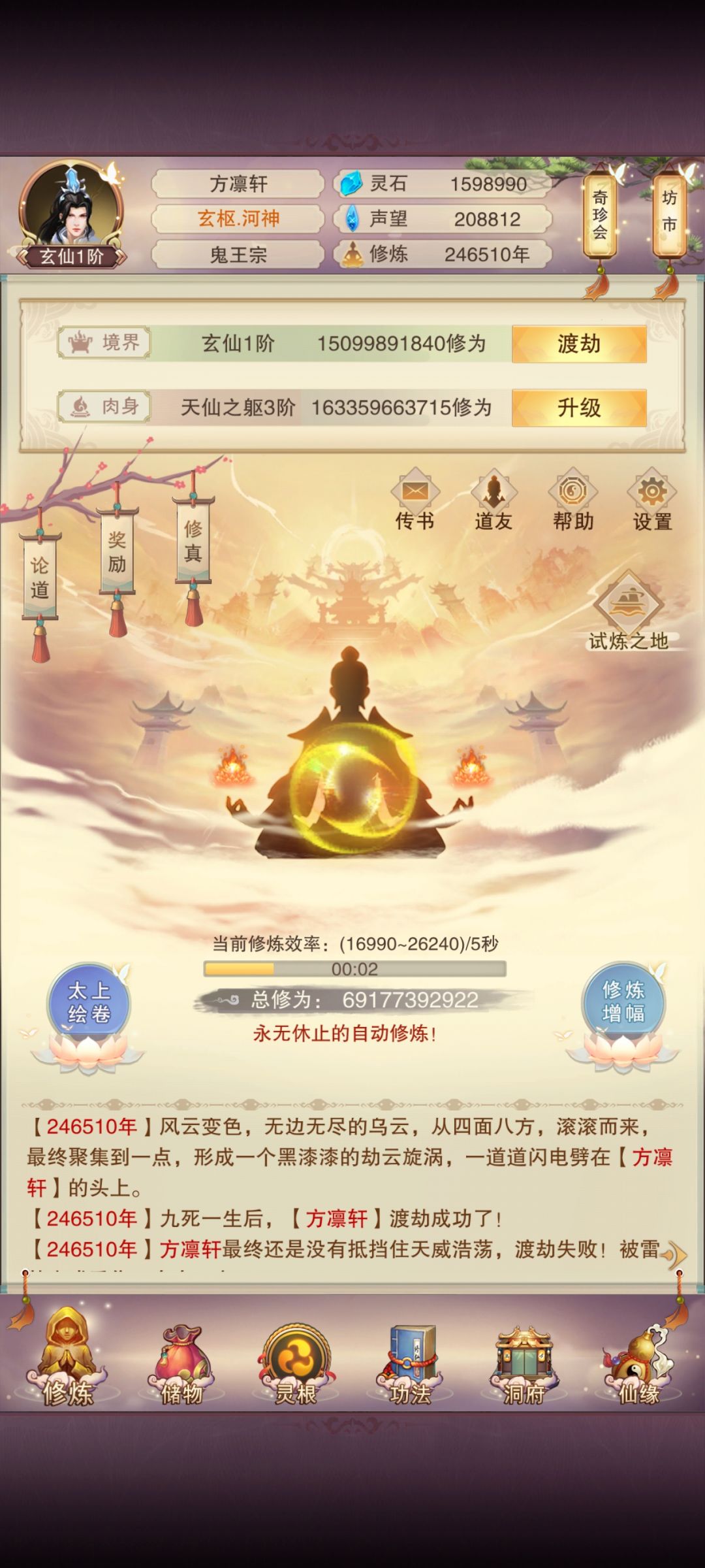 属性和技能点如图所示 1.27+聚灵228,目前肉身万象9+38e,均跳大概15.7,预计1.55天仙吧,区环境好些(不堵车)的青云+氪600/900天秘+欧点儿,速度可超我。 分神没氪3天掌门,氪150绝秘,合体补氪150*4+120=720绝秘,因为堵车第一本3k天秘耽误了2周多。目前刷门派还差7星1个,8星2个:青云和宵水,9星2个:神兽和玄武,如果欧/正常些的话,现在已刷到神兽(和青云),