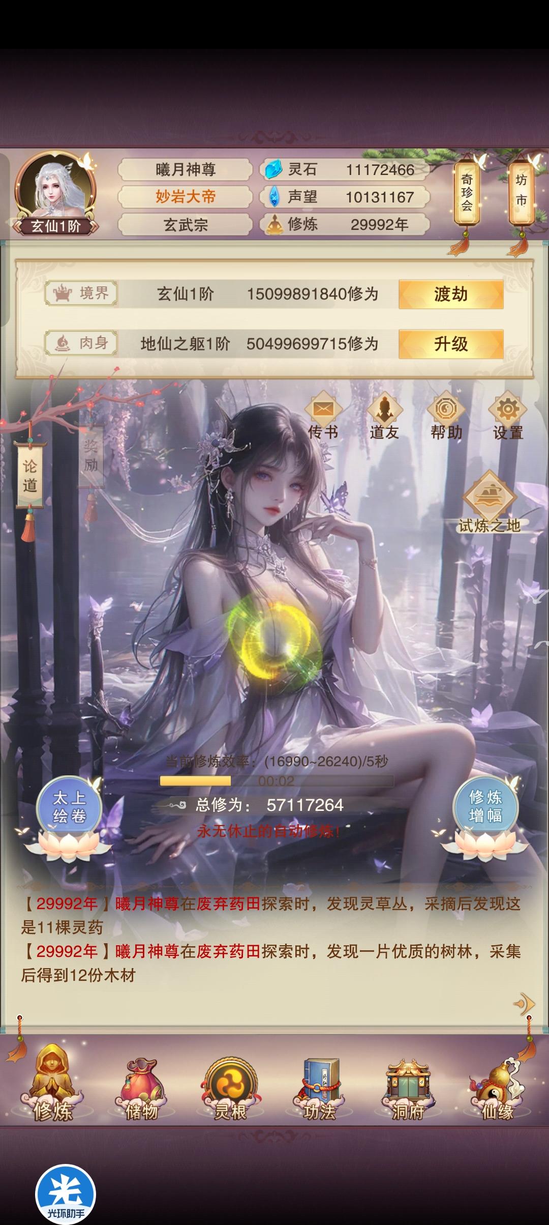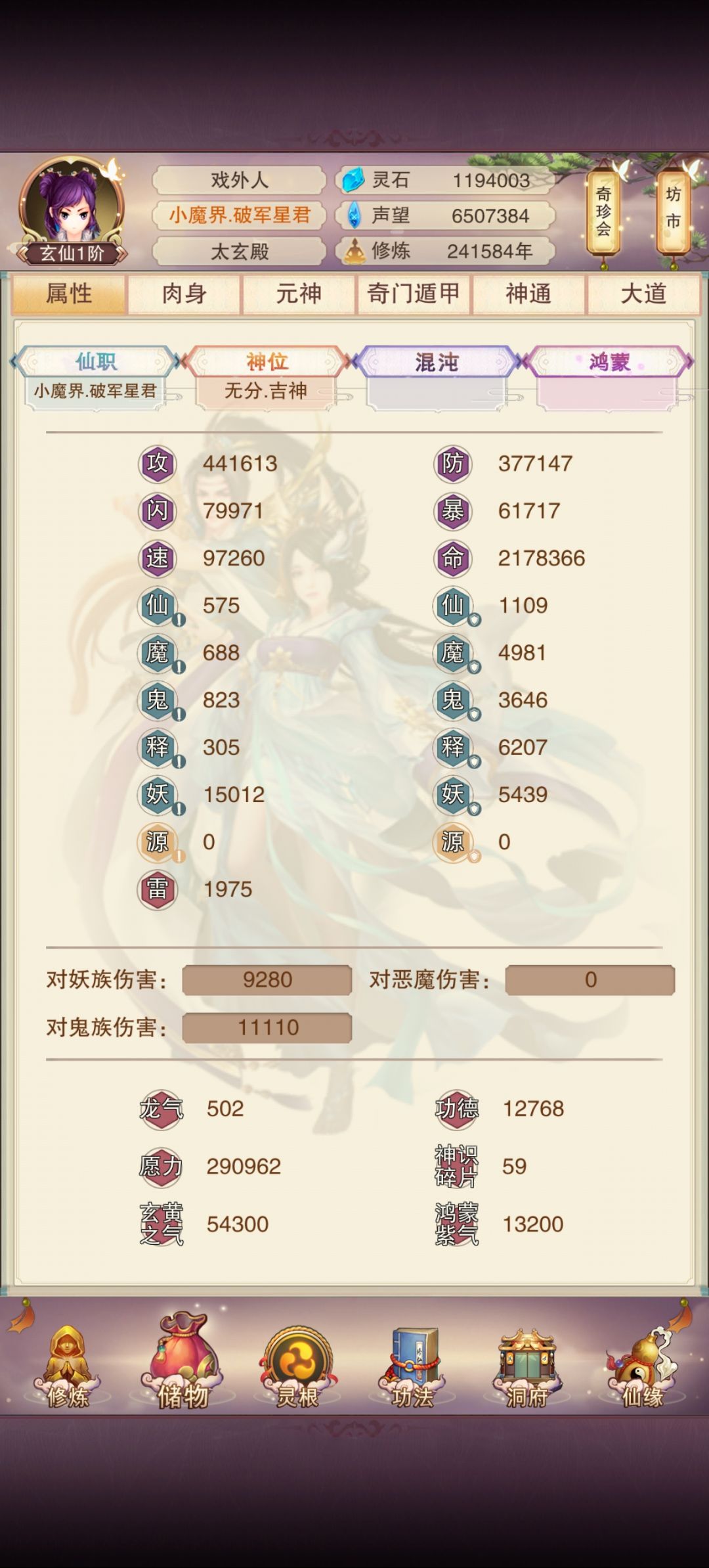 继上次的仙尊简单记录()已经过去了四千年,离游戏的六万年还差两千年,简单记录下准帝仙的情况,等六万年整的时候再详细记录各个进度和属性。 修为平均157W/跳 属性136/155,较刚刷完仙尊门派的122/141,攻防分别涨了14W和14W。。。。[表情_疑惑][表情_疑惑][表情_疑惑],居然攻防涨的这么平均 其他进度: 万龙:好消息是终于存够龙晶练好了(最后一个龙晶鬼佬卡了我15天,前面9个平均