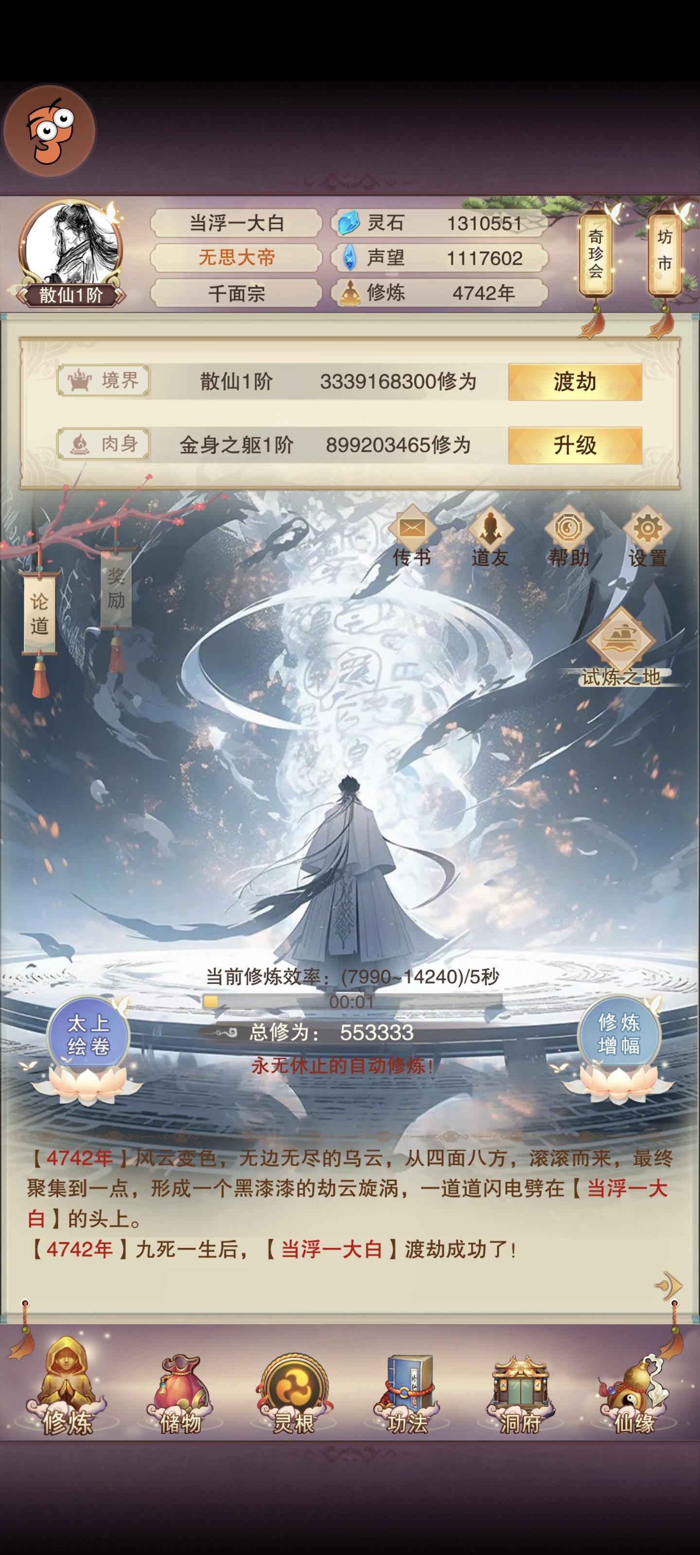 《散仙悟真赋》混沌初开悟道真,丹炉焚尽旧凡身。九重雷劫淬仙骨,一点灵光透紫宸。曾踏千山寻玉液,几经沧海辨龙鳞。今朝得窥长生术,方知妙法在守心。紫府云腾养道胎,星河为链系灵台。尘缘未尽且徐行,笑看人间花落开。——感念修行二千九百载,终脱凡胎成散仙。大道漫漫,此法不过初叩玄门;仙路迢迢,犹待三花聚顶、五气朝元之日。且御清风,游乎四海八荒之间。
