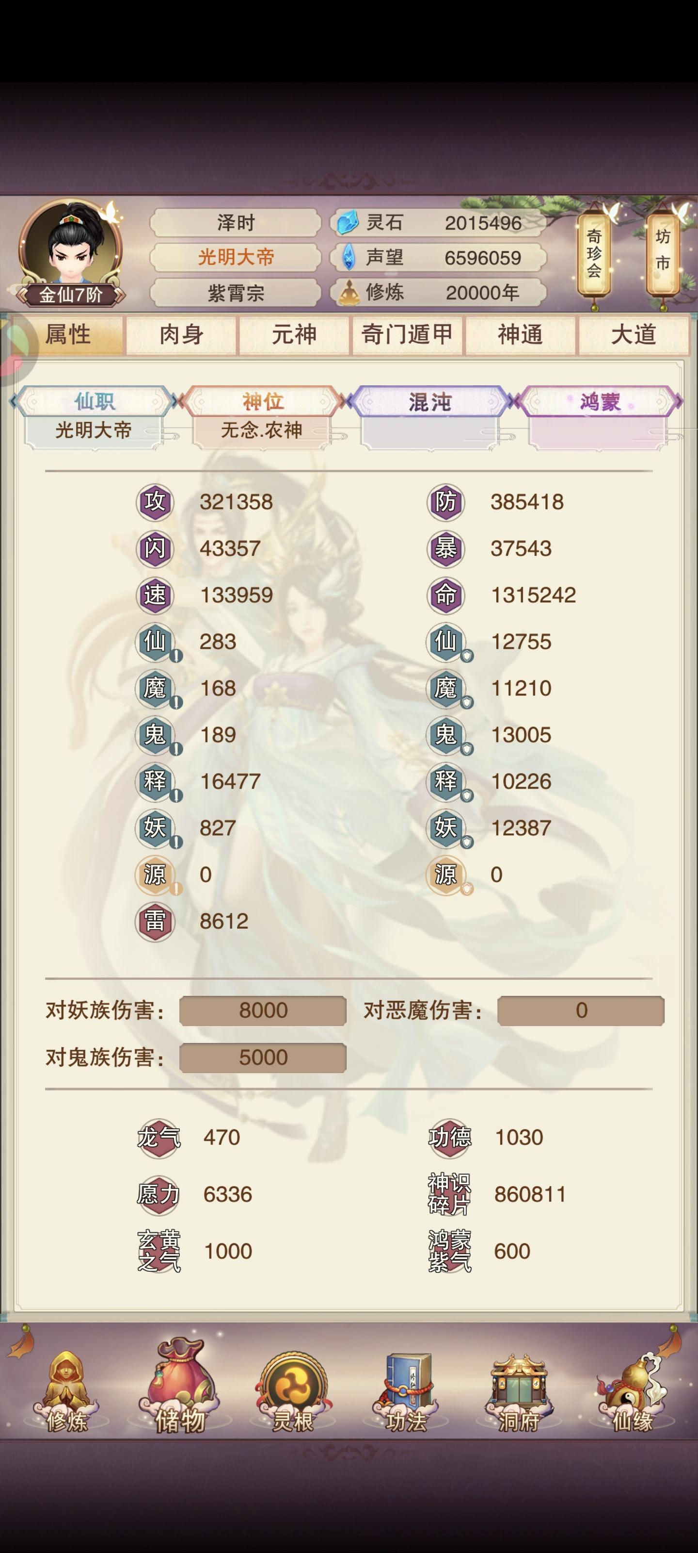 年份:4484年攻击:180704防御:405150血量:444533修为:平均50W一跳神界目前给1.2星攻防、秘术以及真伤真防学完。技能点:29个(由于刷门派不顺利,导致忘了有5个信物门派心法未学)炼体池预计明后天即可开启刚开启听课,目前听课两次,尚未遇到圣人洞府:肉87-聚灵139-洗髓71(还余约60万草铁未使用)