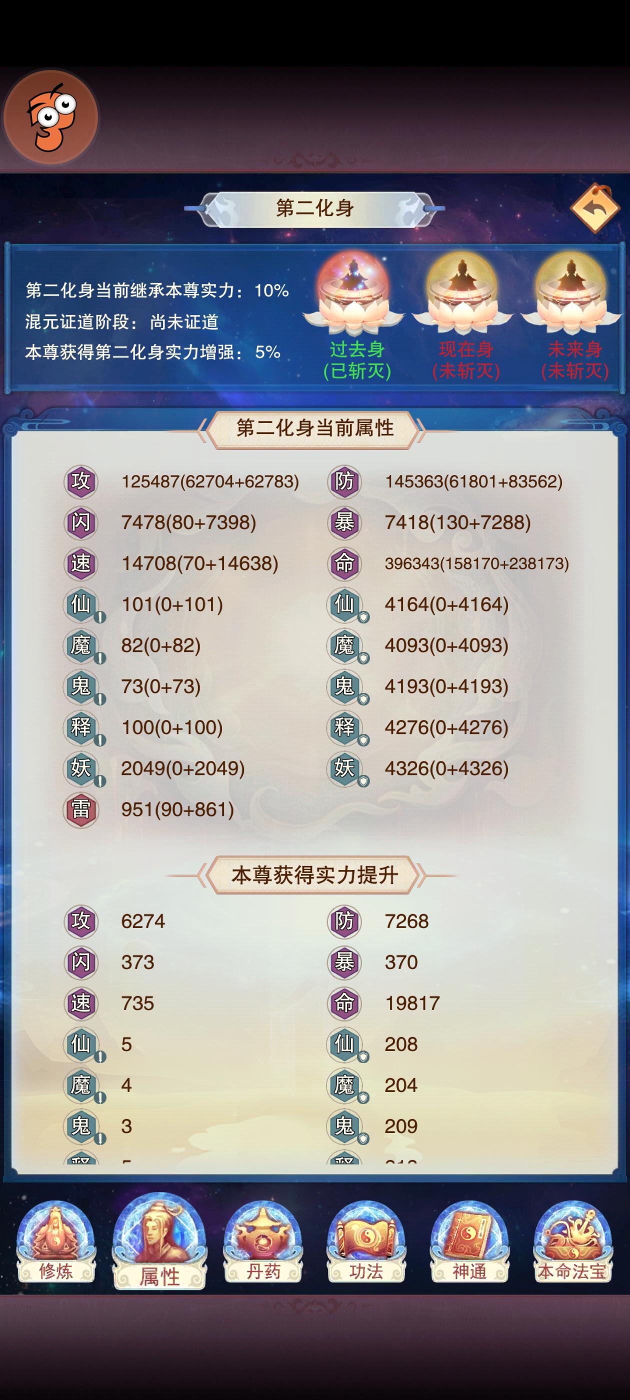 时隔2月(大概)防御属性破千万;上台感言:有一说一其实快坐化了,游戏看的少了关注的也少了唯一的乐趣就是在群里和道友们插科打诨吃吃瓜,如果没有昨天这个更新爆料那大概率,千万属性以后就坐化了。修为方面:彻底放弃修为(因为没用了),五转渡劫丹我都不买了,紫气留着(大用,根本不够用);属性方面:由于阿鬼的产能太低,使得我对游戏没有盼头(例如:夕阳游戏谁敢充钱)。所以氪金很早就已经停了。接下来目标是吃