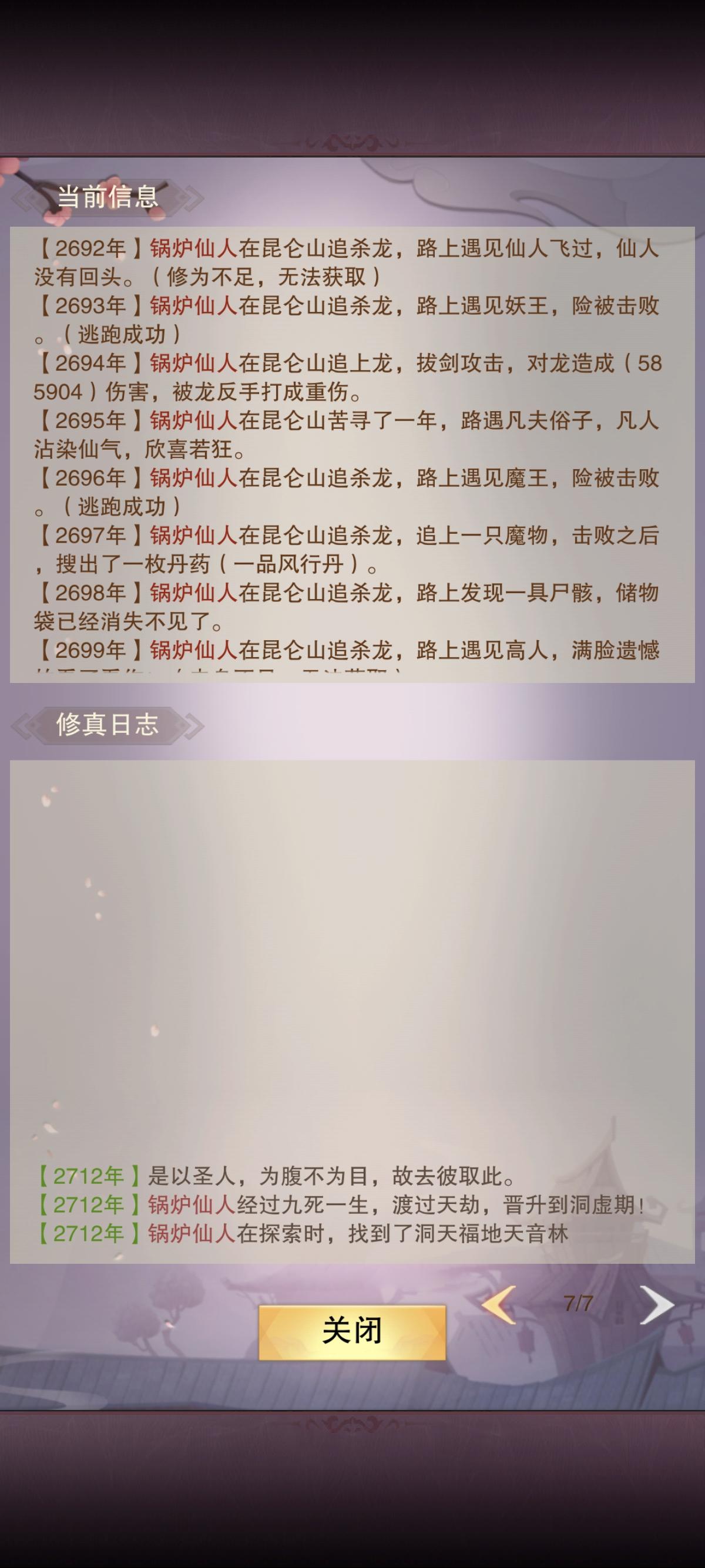2716年记录修道未满三千载,遽登洞虚。然破境之速,快如星陨慢似岁移,望早臻至洞虚三阶入阵门修习奇巧。幸甚至哉,今晨观天象而罢伐接引之役,惜仙缘自断。然大道殊途,并非永绝强者之列。勉勤修不辍,以期同诸君早证混元,长生久视。