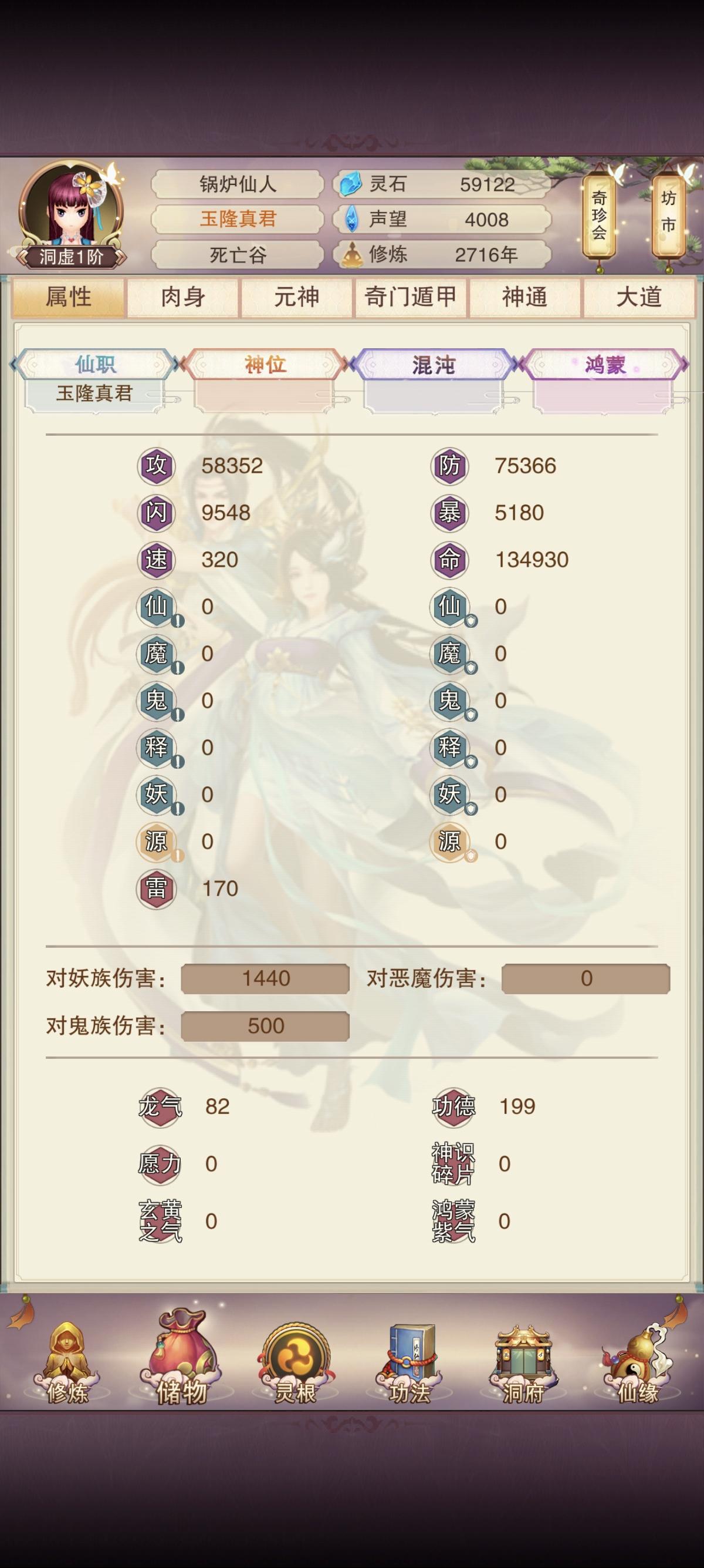 时隔2月(大概)防御属性破千万;上台感言:有一说一其实快坐化了,游戏看的少了关注的也少了唯一的乐趣就是在群里和道友们插科打诨吃吃瓜,如果没有昨天这个更新爆料那大概率,千万属性以后就坐化了。修为方面:彻底放弃修为(因为没用了),五转渡劫丹我都不买了,紫气留着(大用,根本不够用);属性方面:由于阿鬼的产能太低,使得我对游戏没有盼头(例如:夕阳游戏谁敢充钱)。所以氪金很早就已经停了。接下来目标是吃