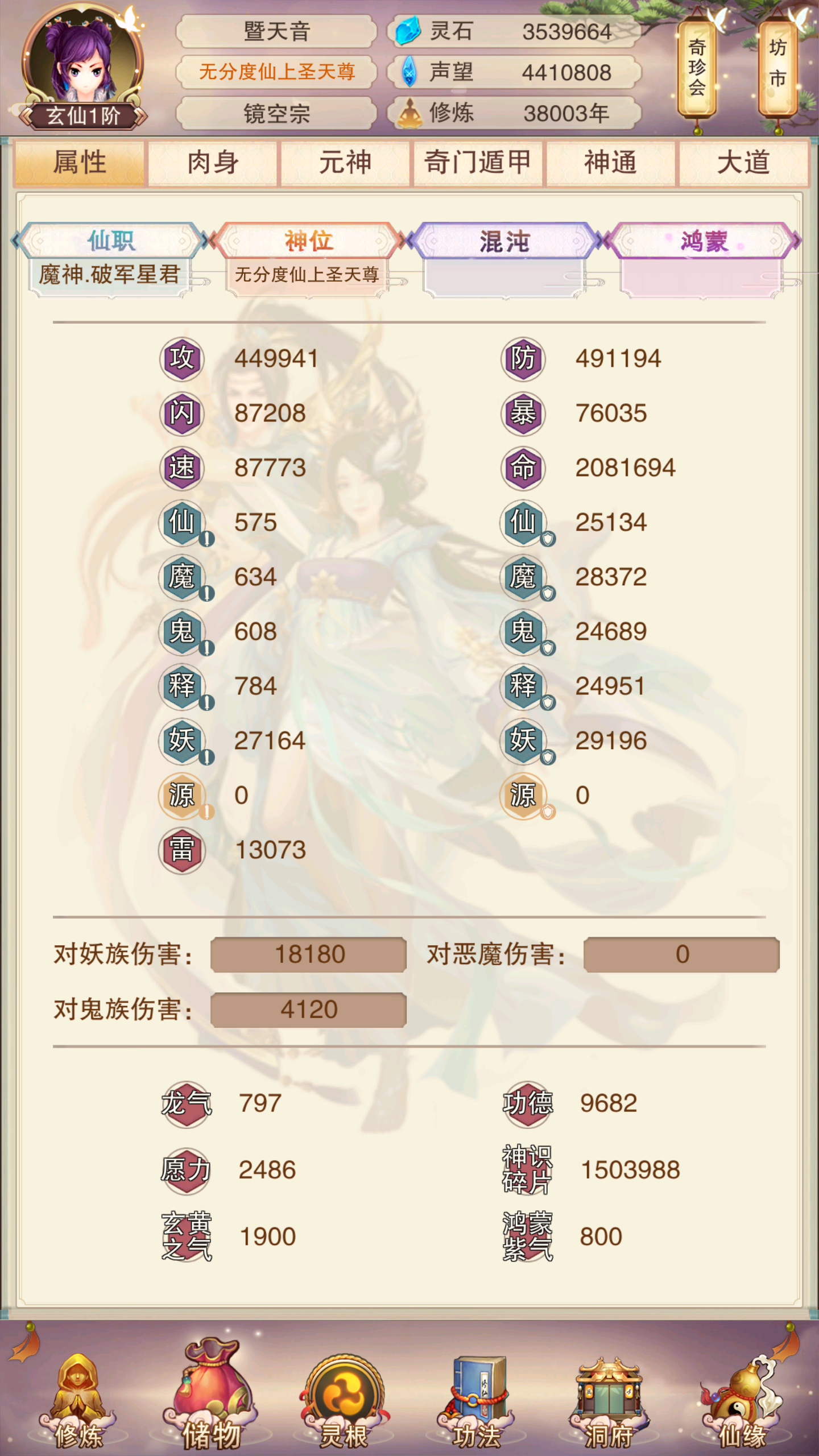 总结一下,修真13864年,今天刚到天仙,属性基本31-34-84,天十五进度没到一半,属性图各项附上。祝各位道友鸿运昌隆,飞黄腾达!