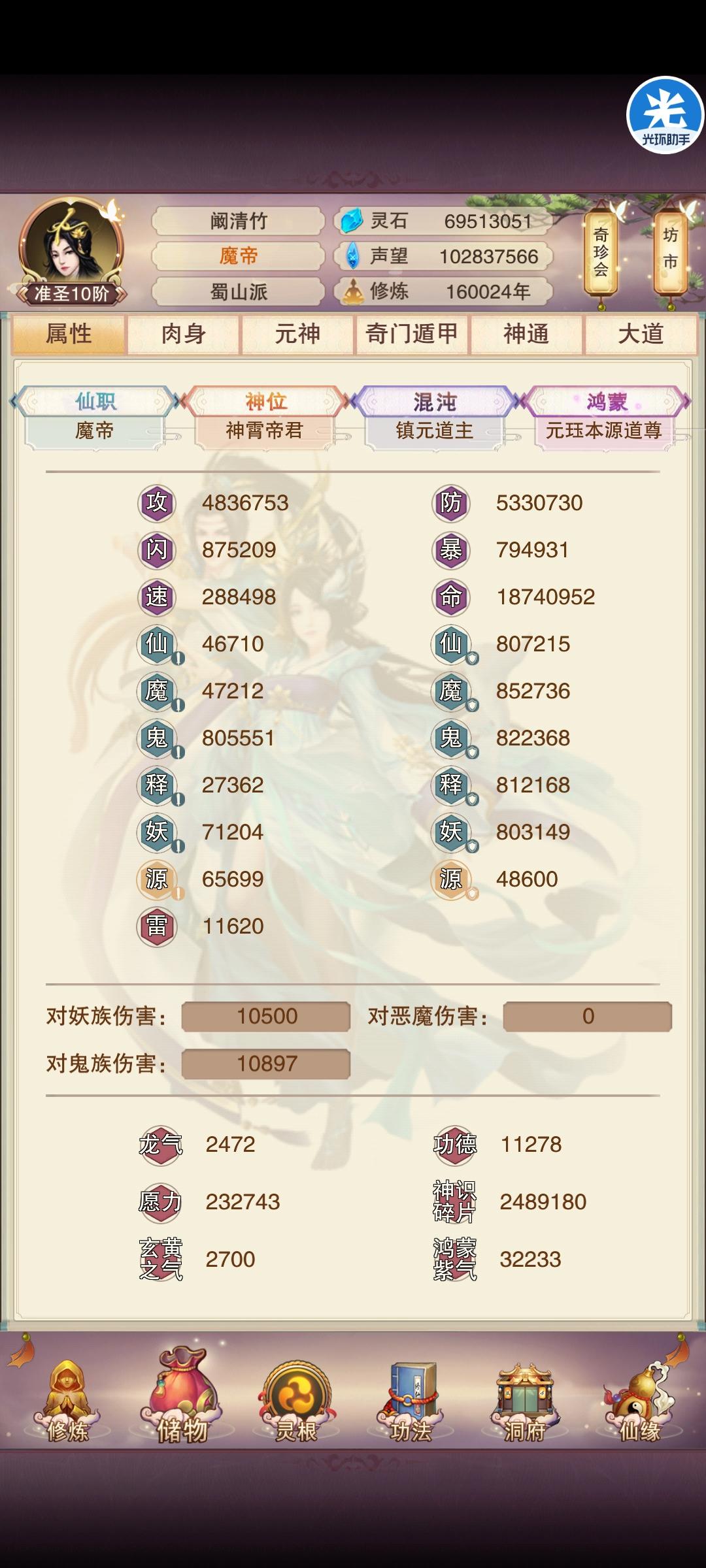 年份:4484年攻击:180704防御:405150血量:444533修为:平均50W一跳神界目前给1.2星攻防、秘术以及真伤真防学完。技能点:29个(由于刷门派不顺利,导致忘了有5个信物门派心法未学)炼体池预计明后天即可开启刚开启听课,目前听课两次,尚未遇到圣人洞府:肉87-聚灵139-洗髓71(还余约60万草铁未使用)