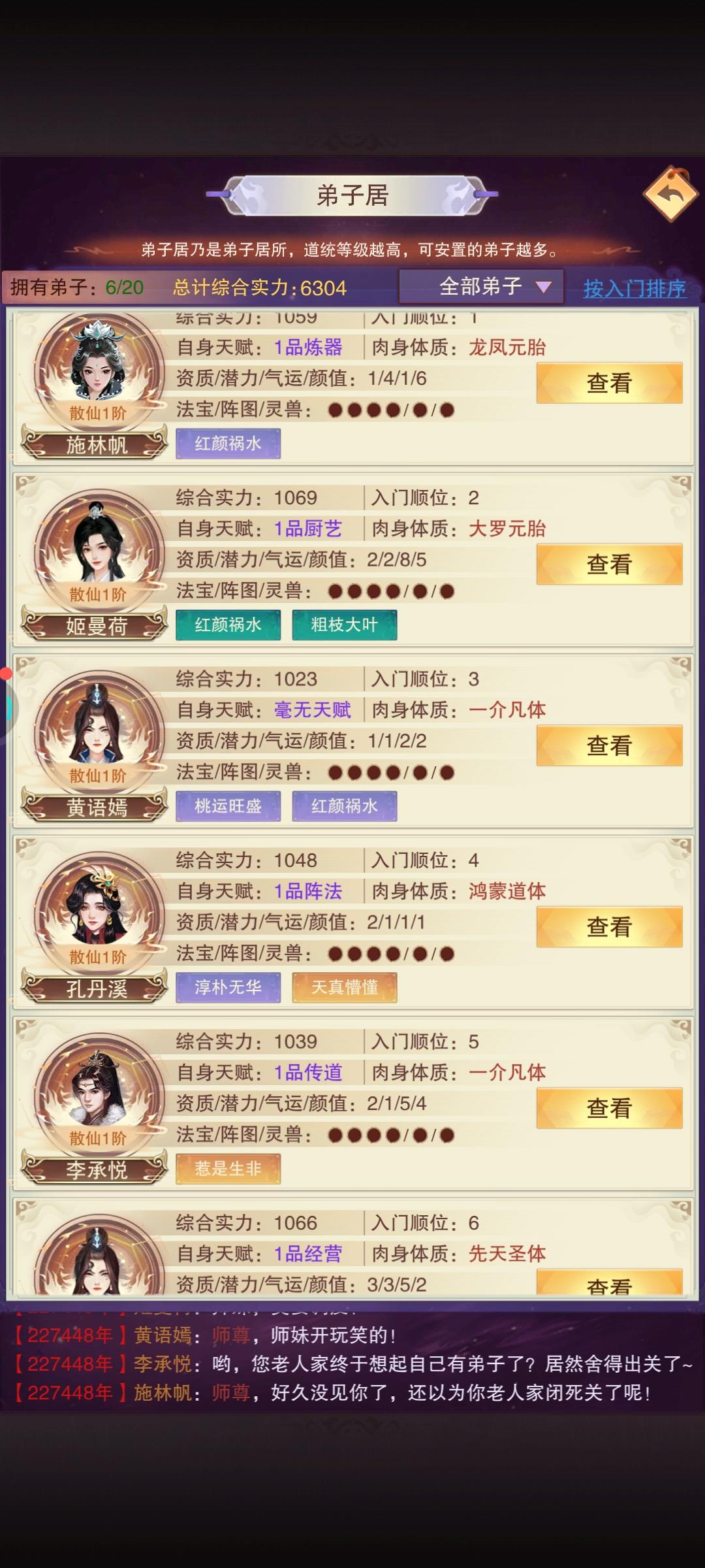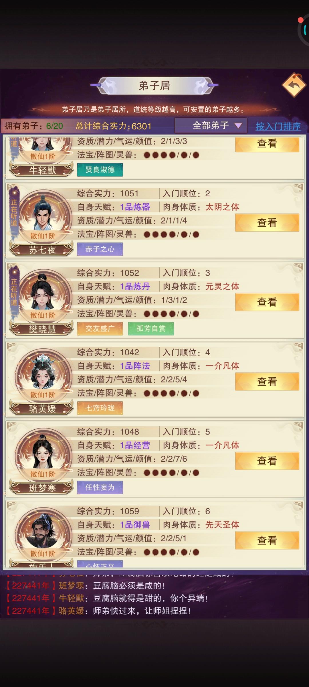 本人是九游服提前更新的,玩了几天有一点点猜测就是弟子每天只有三个人会进行有劳作剩下的人第二天刷新才会进行劳作如果猜测是正确的话,那么新进入道统的玩家,直接去任务堂,把两个游历任务一个机缘任务都给挂上去,剩下两个随机挂因为游历还有机缘任务都是要经历几天的,当你的弟子全部都在游历之后那么,可以在每天卡收益之前,召回三个弟子回来准备第二天听法 ,并且同时根据三个弟子的天赋进行对应的任务优先级。