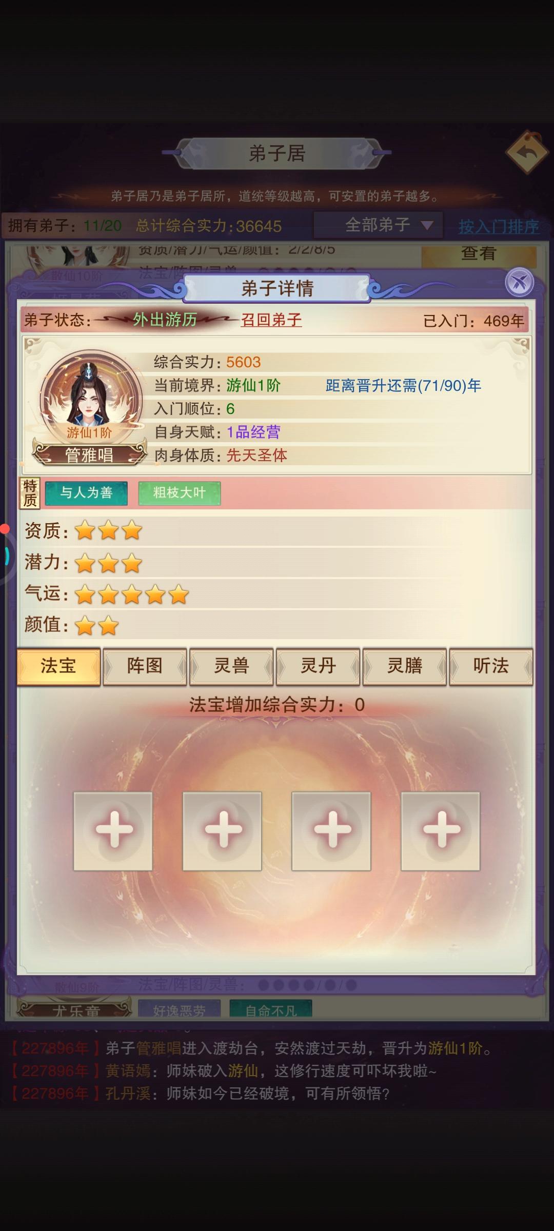 资质:和修炼速度有关,没发现别的潜力:完全没发现和什么有关联气运:关乎所有制作的成功率,可能影响出门游历的奖励颜值:不清楚,也许影响游历的时候别人会不会打你?自身天赋:字面意思,现在没有自身天赋应该是天生弱人一等的体质:各种体质影响法宝灵宠是否契合吧,暂时没有发现能和凡体契合的宠物和法宝,可能还会影响后续的弟子杀阵特质:可能隐性加了什么属性吧或者是游历时增加了隐藏属性总之不太清楚。