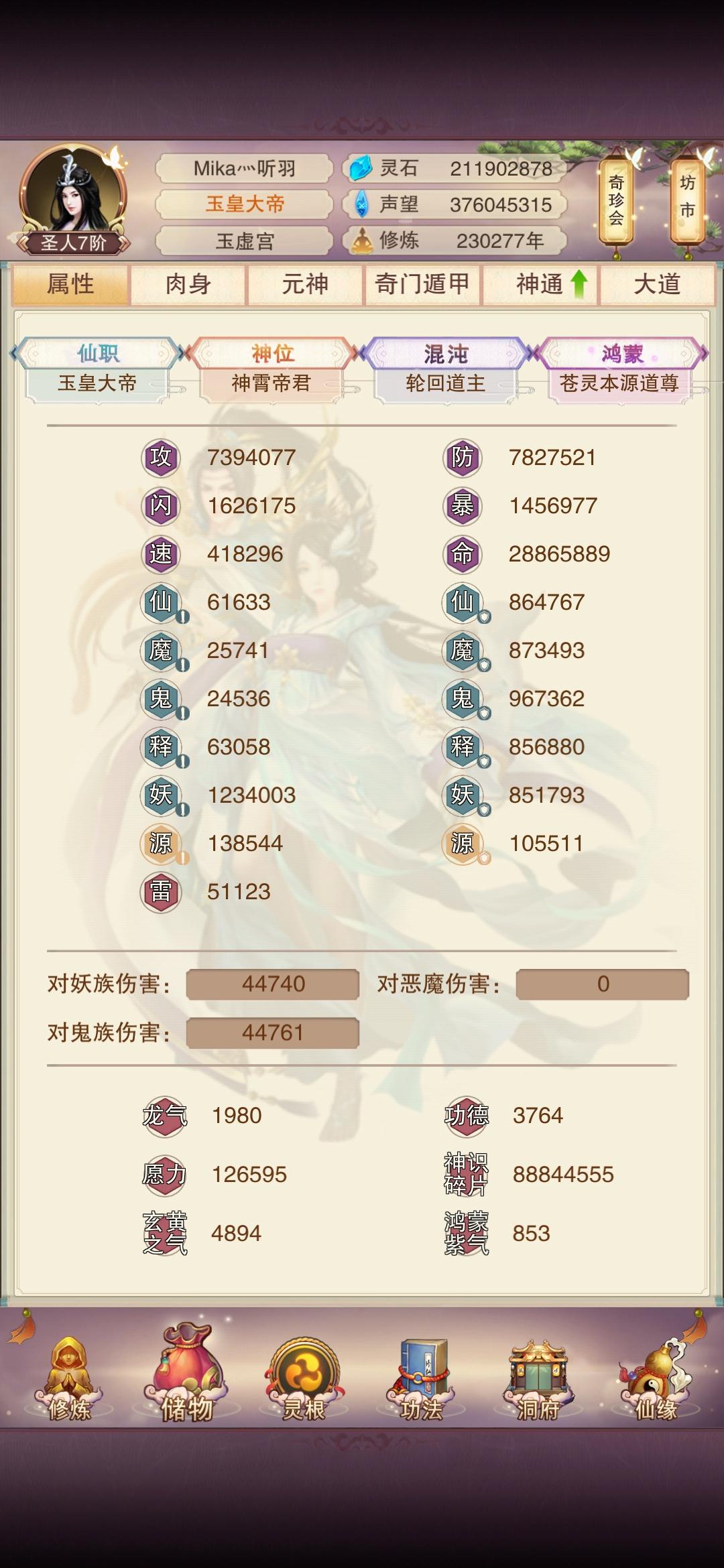麒历5508年,红尘修炼,终证天仙。仙体初成攻:218684防:432302血:568735修为:54万/跳洞府肉:87聚灵:177(还需35-40天左右到达228)洗髓:73技能点:33个(信物防已忘10个)过图:神2-6界主:天8界主帝王比例:目前34:3大道如青天,天仙亦非终点。