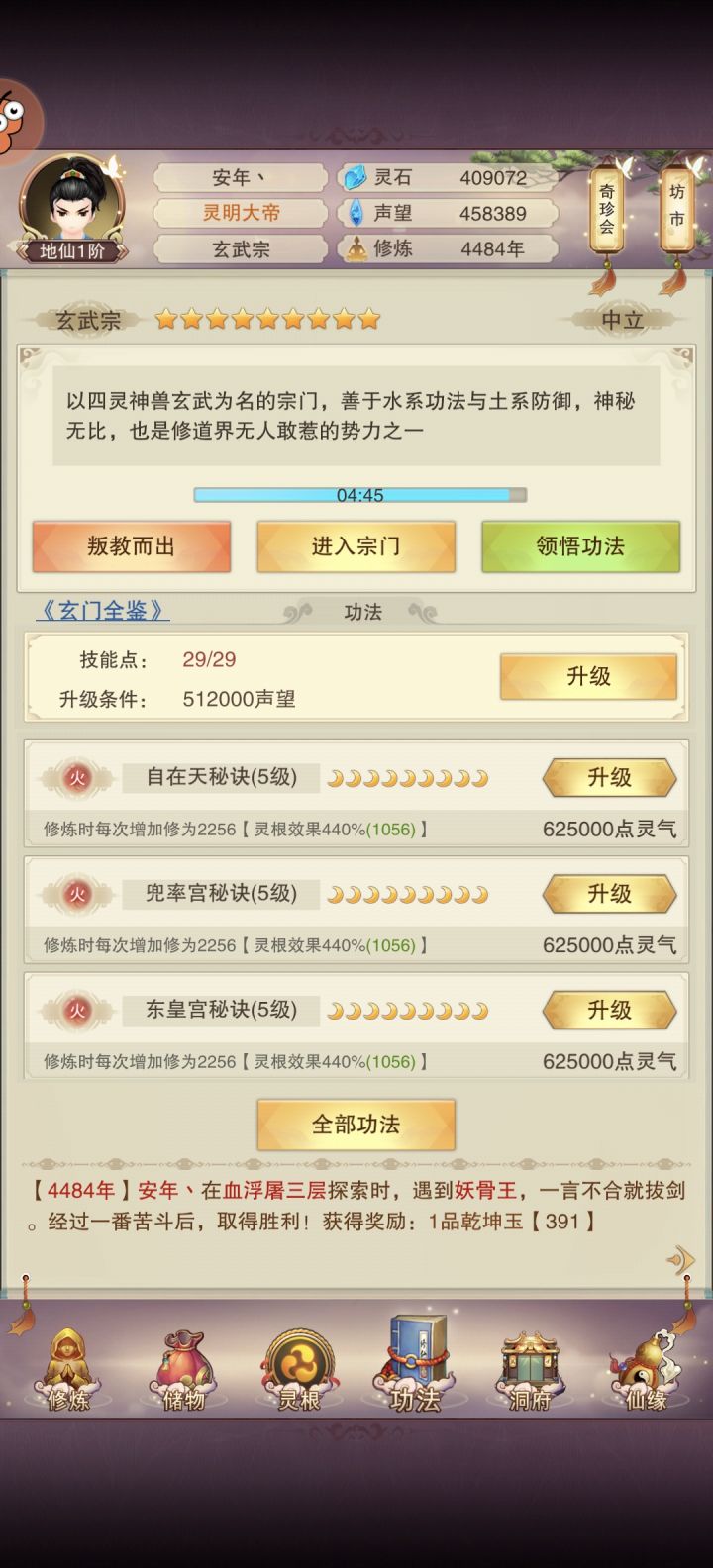 年份:4484年攻击:180704防御:405150血量:444533修为:平均50W一跳神界目前给1.2星攻防、秘术以及真伤真防学完。技能点:29个(由于刷门派不顺利,导致忘了有5个信物门派心法未学)炼体池预计明后天即可开启刚开启听课,目前听课两次,尚未遇到圣人洞府:肉87-聚灵139-洗髓71(还余约60万草铁未使用)