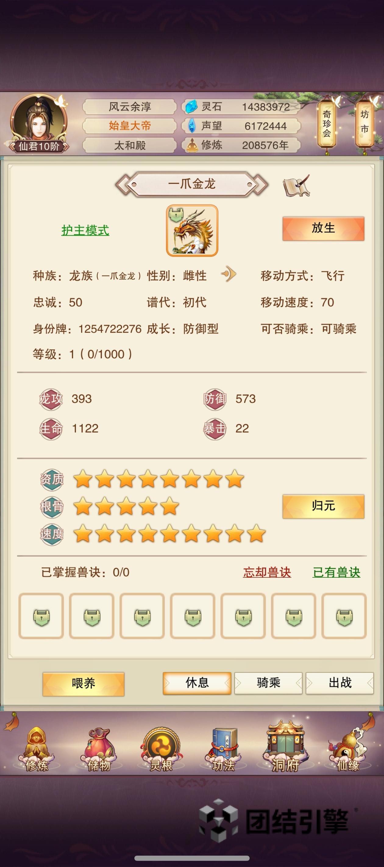 终于合出七代水马,算是达到毕业要求,前后消耗一万多功德,攻防血速四维属性已达50级任务需求,可惜两只七代海兽还是没能突破到七星,八代海兽经验丹不够,预计半年后可以合八代,没心思再合八代。