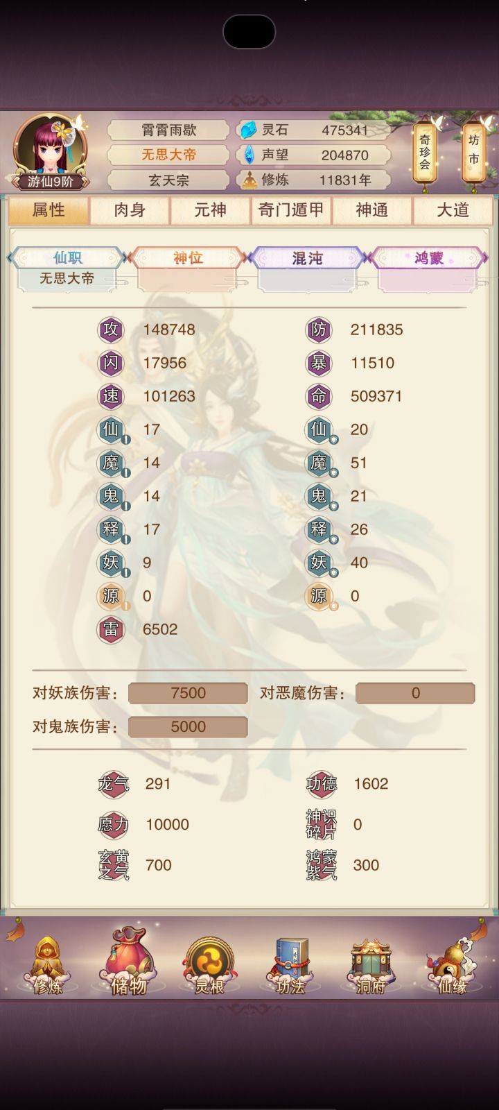 7k攻的狗子,三星青魔,百分之0暴击率抗2杀10的属性,运气很好双妖王一遍过了。解锁神界地图,美美记录一下,美中不足就是低保没打过。另外想问一下,接下来是要继续满玉皇半朱雀到技能点七八十吗,感觉上了神界目前最爽的就是多了个神魔战场